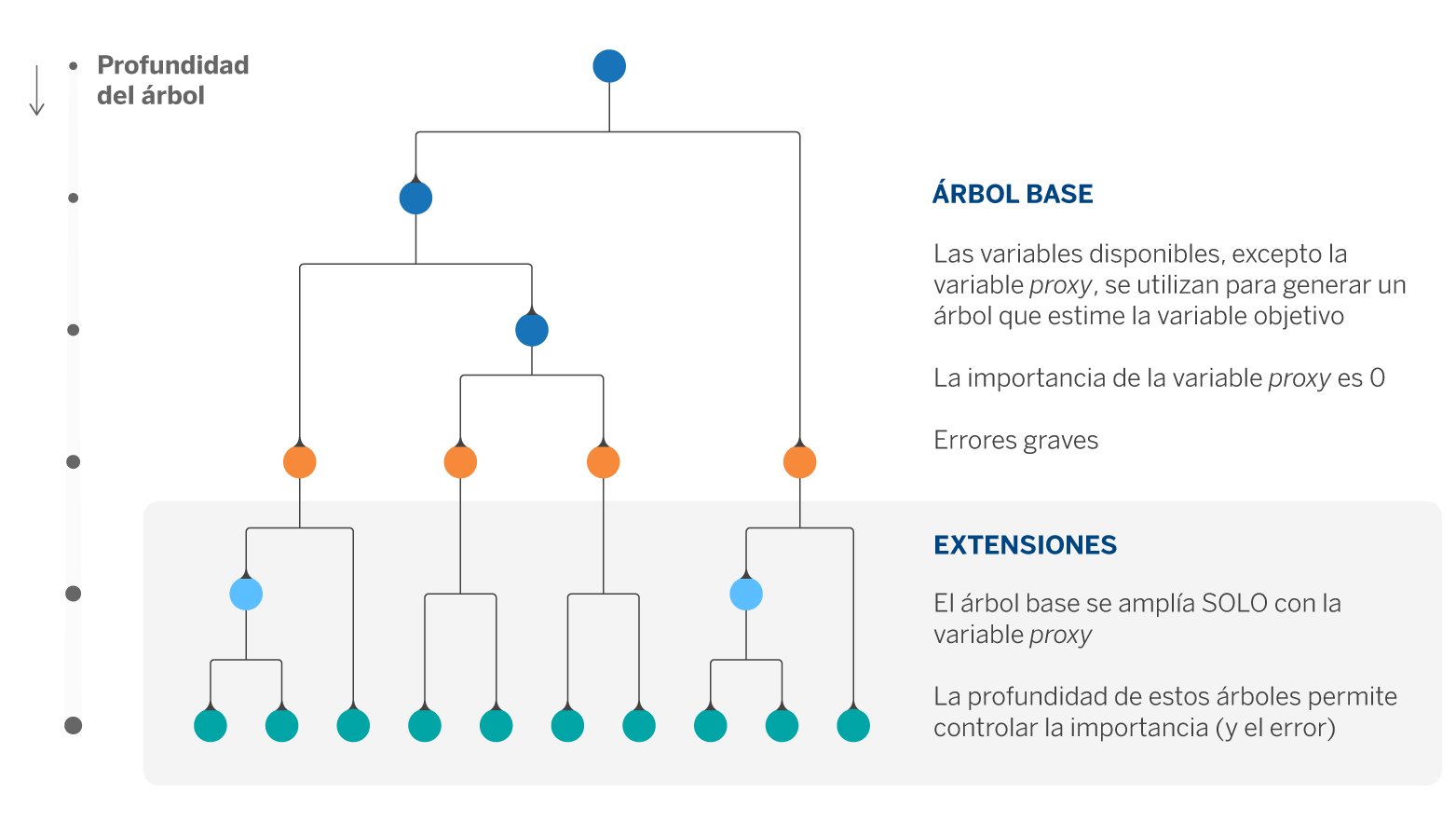 El conjunto de hiperparámetros compuestos por la profundidad del primer árbol y las profundidades de las n extensiones (donde n es el número de hojas del primer árbol) permiten tener el control sobre la aportación de la variable cuya importancia se desea limitar.