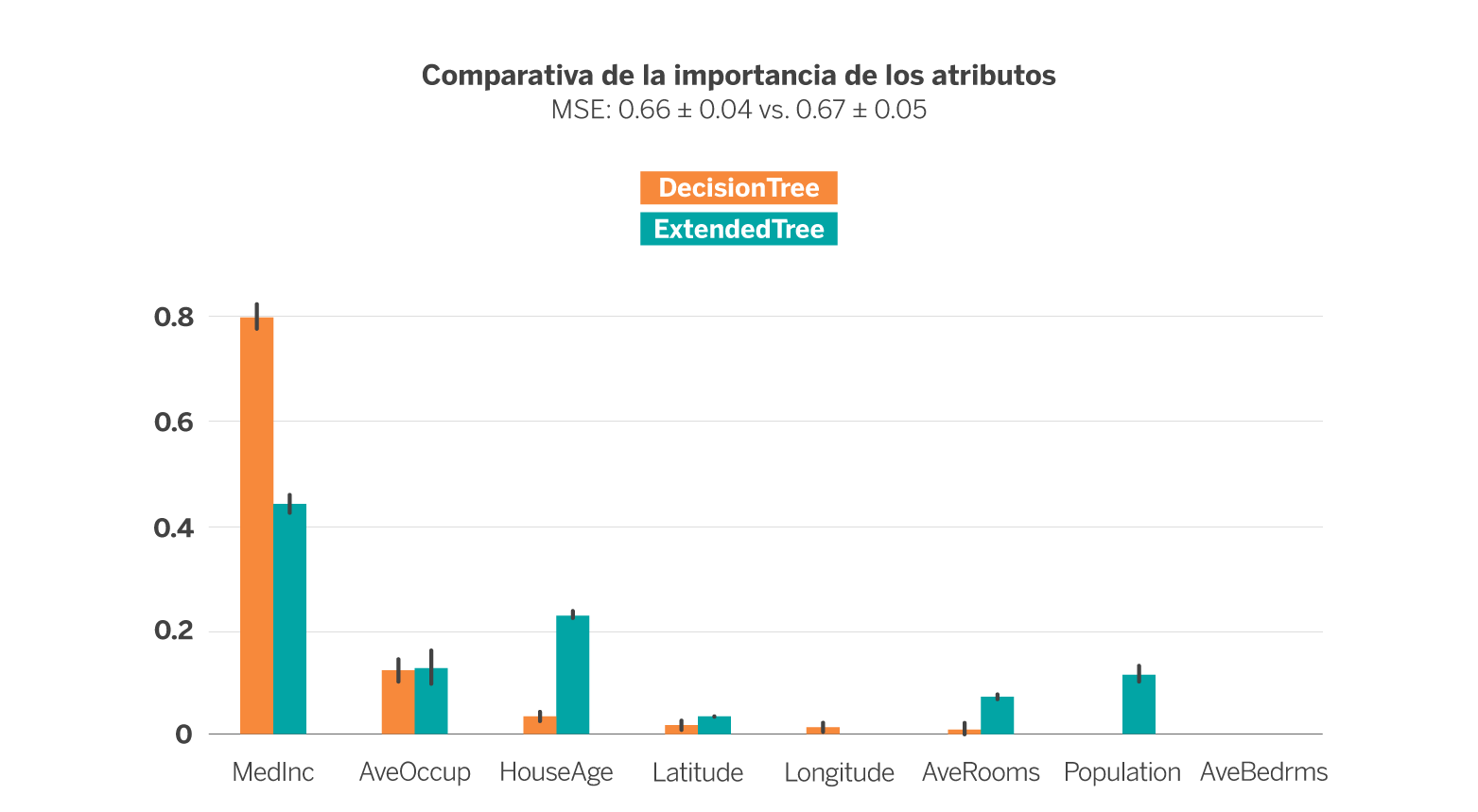Si nos fijamos en la importancia de cada variable en cada modelo (representado por la altura de la barra) se observa que el DTR depende en ~80% de la variable MedInc, la siguiente más importante es AvgOccup con algo menos del 20% y el resto de variables apenas influyen en la estimación del modelo. En el caso de ExT, sin embargo, la variable más importante sigue siendo MedInc pero en poco más del 40%, quedando además la importancia más distribuida entre el resto de variables.