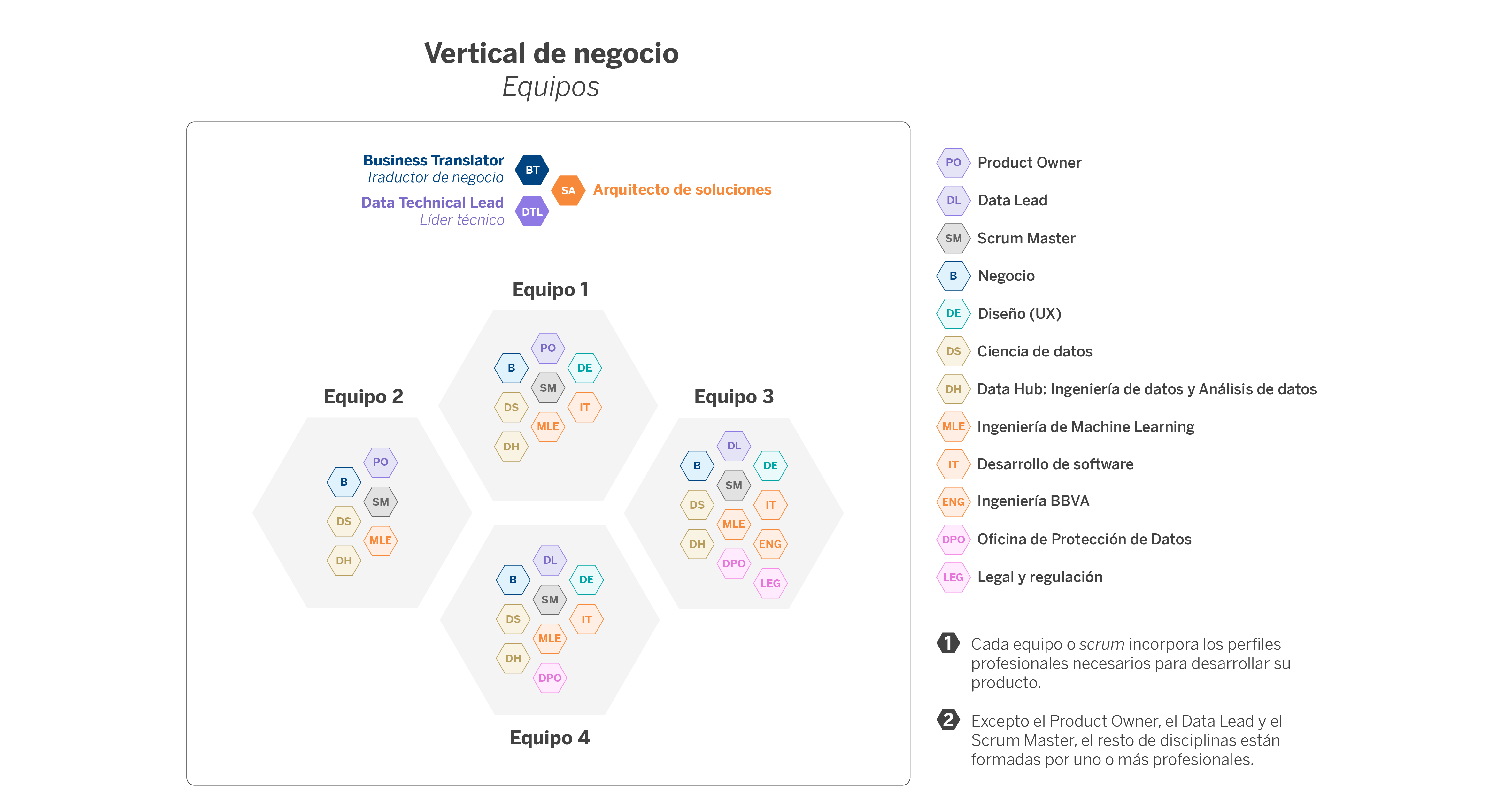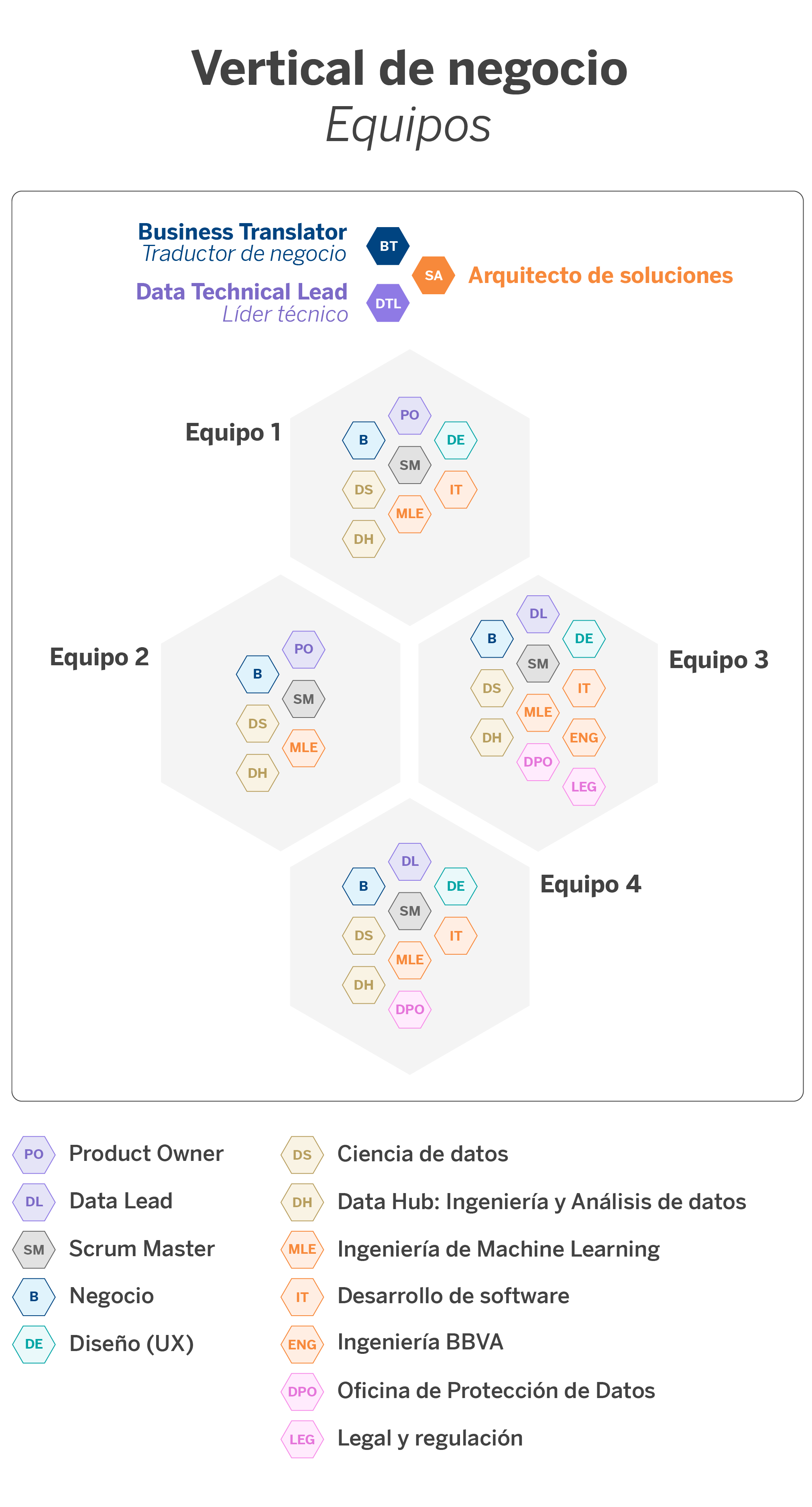 Podemos hablar de varios tipos de estructura de equipo. La diferencia fundamental reside en el entorno donde se ejecutan los modelos desarrollados. Por ejemplo, si un equipo crea modelos cuyo resultado se mostrará en la aplicación móvil del banco, es indispensable integrar perfiles de diseño expertos en experiencia de usuario (UX) y desarrollo de software (IT). Por otro lado, si los modelos se ejecutan en estructuras internas del banco, es fundamental contar con figuras que ayuden a trasladar la información a estos entornos específicos, como lo son perfiles del área de ingeniería de BBVA.