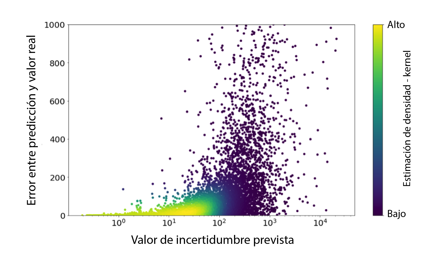 El tipo de incertidumbre que hemos tenido en cuenta adquiere gran relevancia a la hora de proponer un nuevo modelo que pueda predecir los próximos gastos e ingresos de los clientes. En el siguiente gráfico, cada punto representa un cliente situado según su error de predicción real y su puntuación de incertidumbre prevista. Podemos observar cómo los puntos amarillos (que representan a la mayor parte de los clientes) tienen un bajo error de predicción y una baja puntuación de incertidumbre, por lo que podemos entender esta puntuación como confiable.