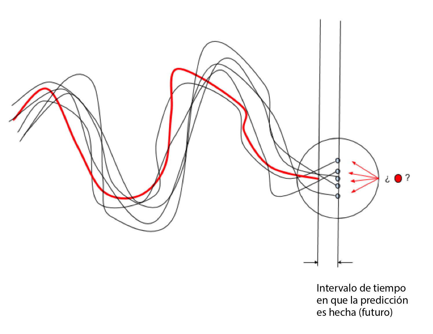 La siguiente figura muestra gráficamente el concepto de incertidumbre, y responde a la pregunta de cuál será el valor del punto rojo en el intervalo de tiempo dado. En la mayoría de situaciones reales, no es fácil decidir cuál será el siguiente valor de la línea roja (punto rojo).