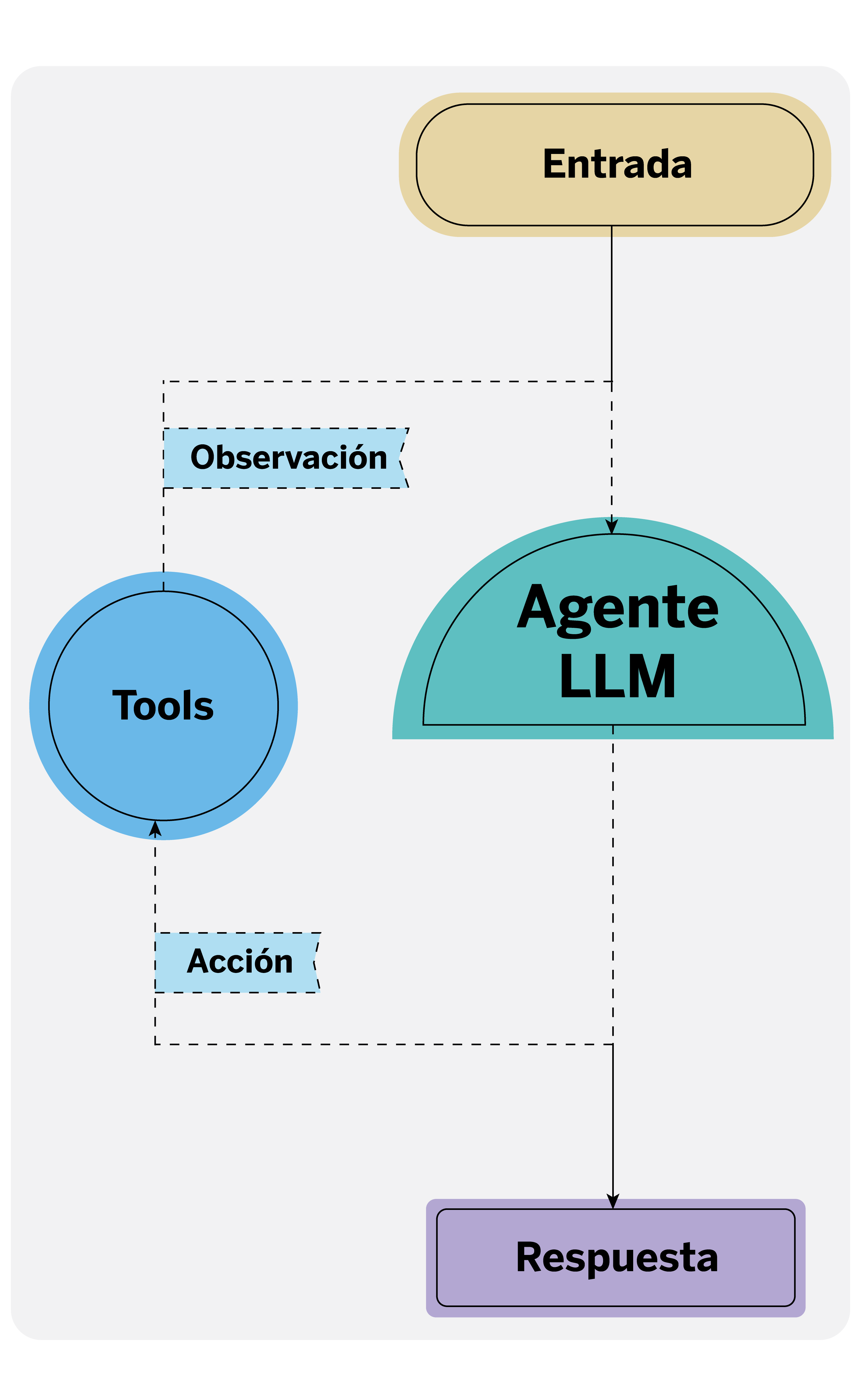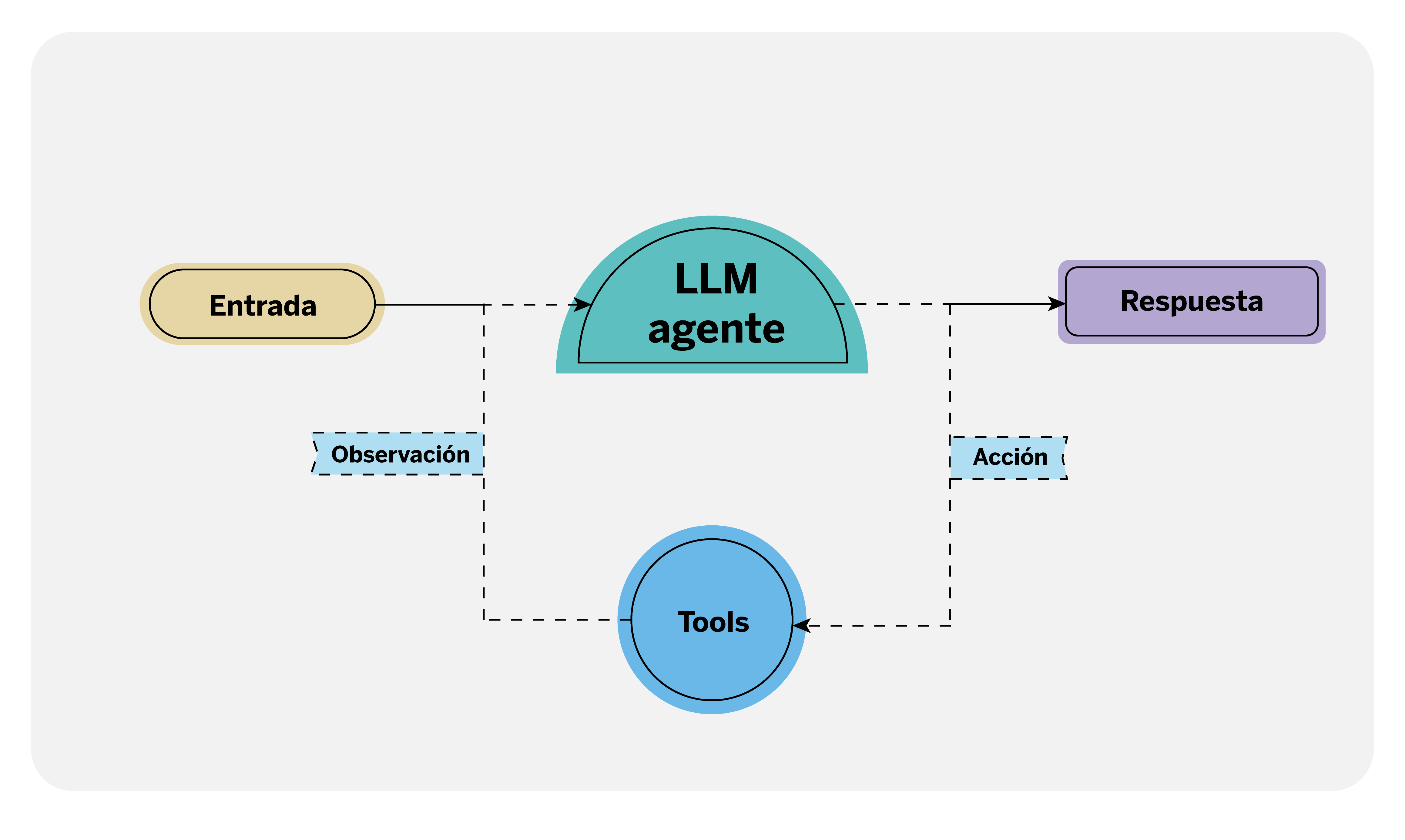 Para que los agentes puedan ejecutar estas acciones, es esencial que estén claramente definidas como ‘tools’2 (herramientas en inglés). Estas tools son componentes que permiten extender las funcionalidades del LLM más allá de su capacidad de diálogo, y deben incluir una descripción detallada de la acción a realizar, los parámetros necesarios para su ejecución y el código correspondiente para llevarla a cabo.