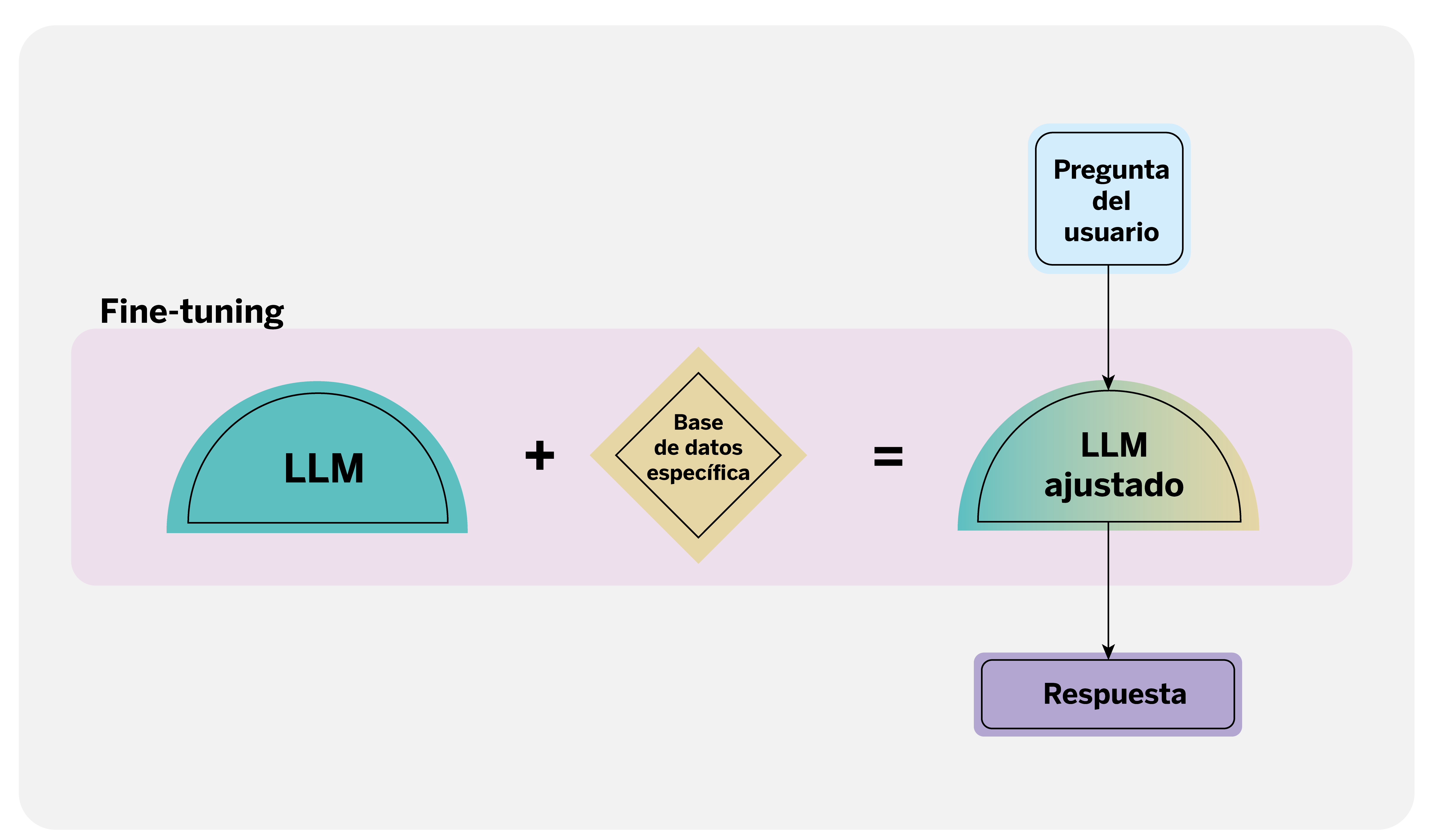Sin embargo, cuando tenemos más información de la que el modelo puede procesar o no sabemos específicamente cuáles pueden ser los documentos que nos ayudan a responder, entran en juego otras técnicas. Las dos principales son Retrieval Augmented Generation (RAG) y fine-tuning. El RAG recupera información de documentos mediante un modelo de lenguaje. Cuando se realiza una consulta, primero se busca en la base de datos la información relevante para responder, y luego se utiliza esta información recuperada para que el LLM genere una respuesta enriquecida y contextualizada.