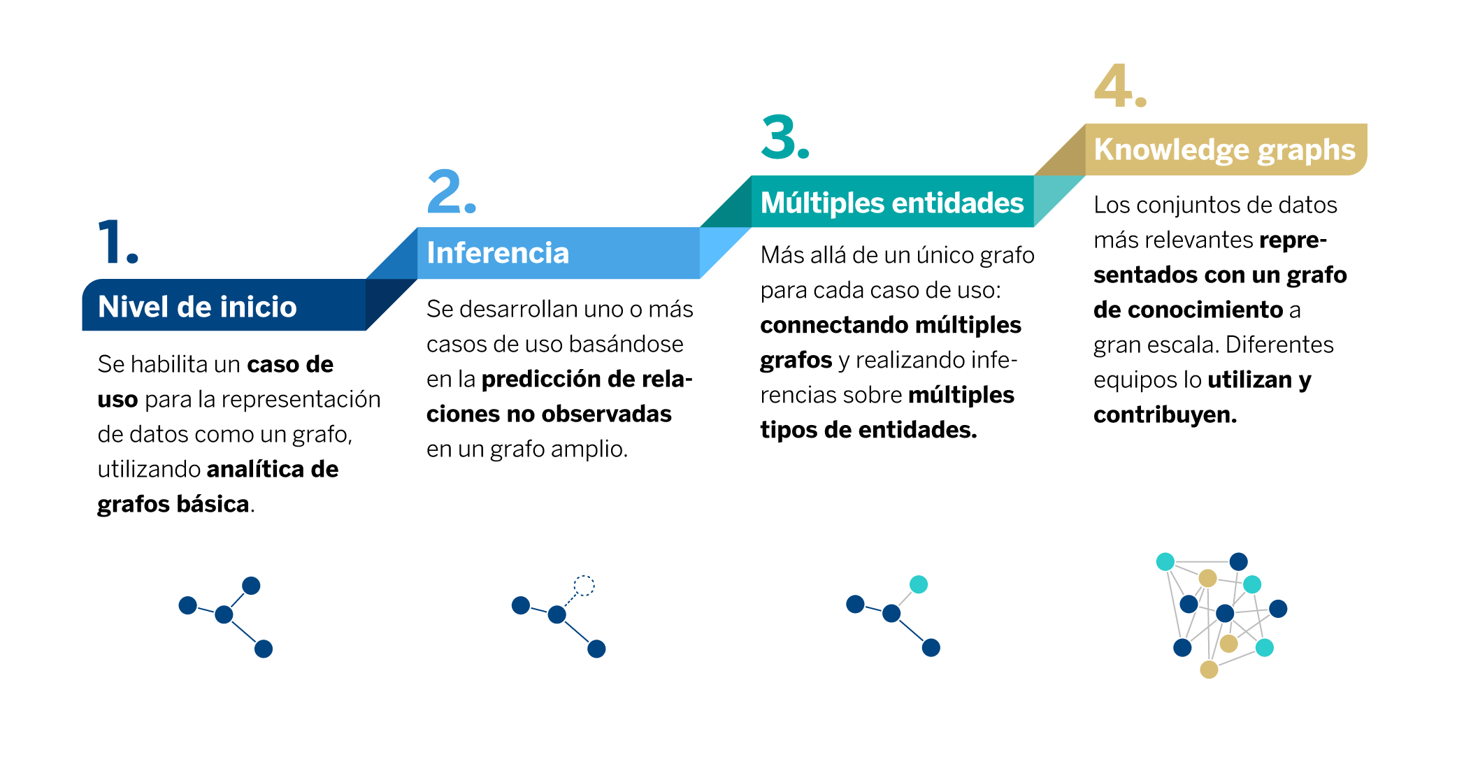 La adopción de tecnologías relacionadas con grafos por parte de las empresas dibuja una curva de madurez que típicamente va desde la fase inicial de la utilización de grafos en un caso de uso, hasta una situación ideal en la que la empresa, de forma recurrente, explota los datos y las herramientas de grafos con éxito. En este proceso podríamos distinguir cuatro fases diferentes, que marcan el camino hacia la adopción de grafos: