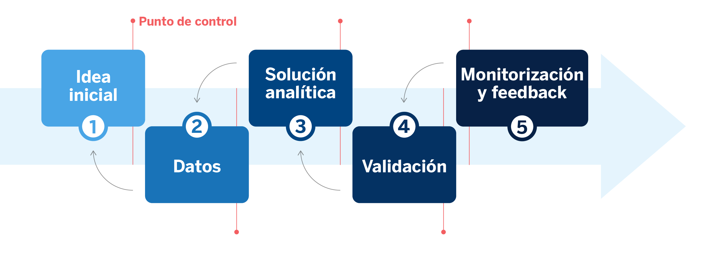 Con este trabajo obtuvimos un sistema flexible y modificable que a lo largo de los próximos meses se aplicará a todos los proyectos de la AI Factory. Este proceso divide todo proyecto de ciencia de datos en cinco fases: 1) Idea inicial, en la que se analiza el objetivo, alcance y viabilidad del proyecto; 2) Datos, que se centra en la información de entrada y salida necesaria para construir la solución; 3) Solución analítica, que cubre cada una de las iteraciones del proceso de desarrollo del modelo a partir de las features obtenidas en la fase anterior; 4) Validación, que se ocupa de ratificar la solución mediante los KPIs de negocio y las métricas utilizadas sobre los conjuntos de train, validación y test; y 5) Monitorización, en la que se pretende determinar qué se quiere monitorizar una vez la solución esté en producción desde diferentes perspectivas: stakeholders y científicos/as de datos.