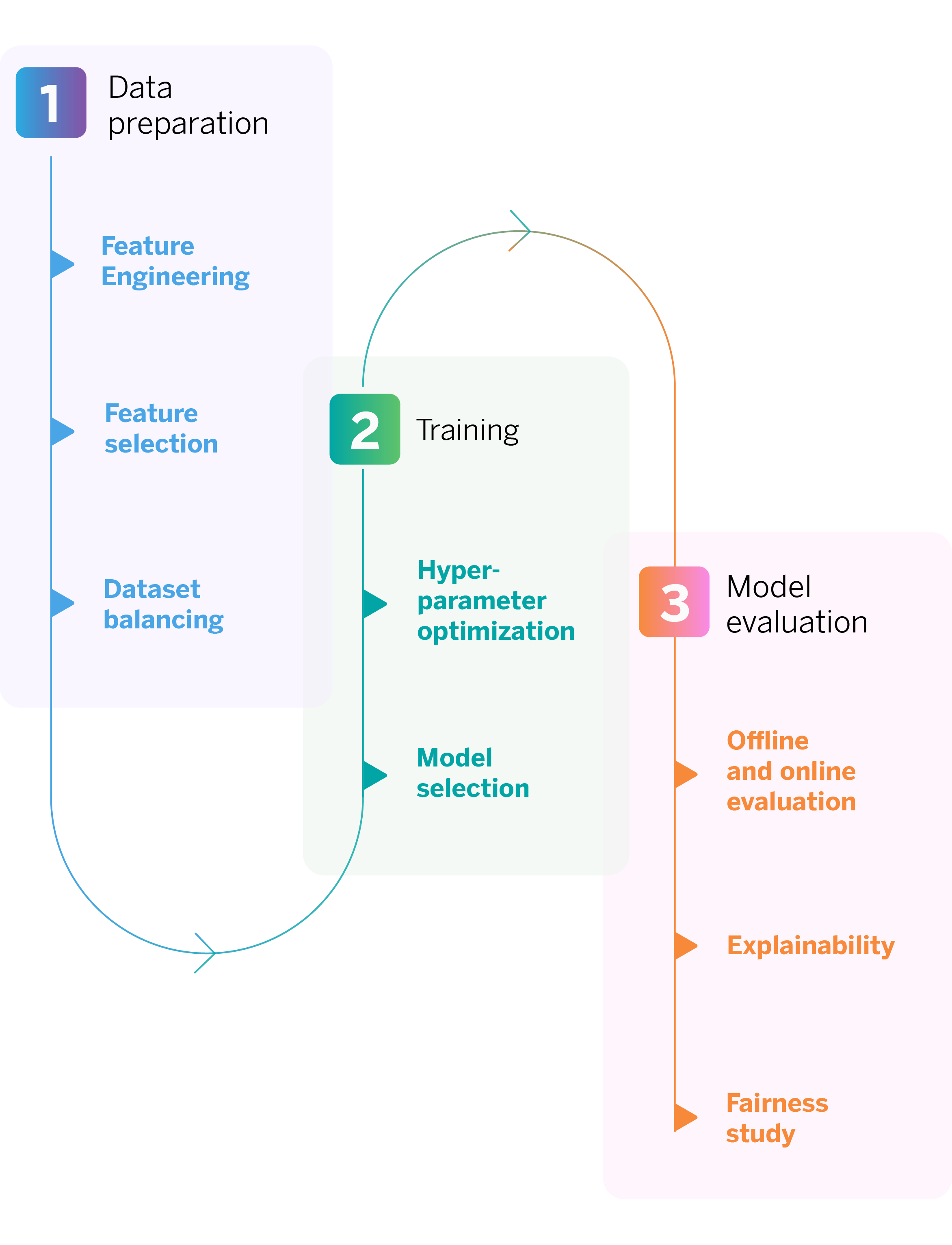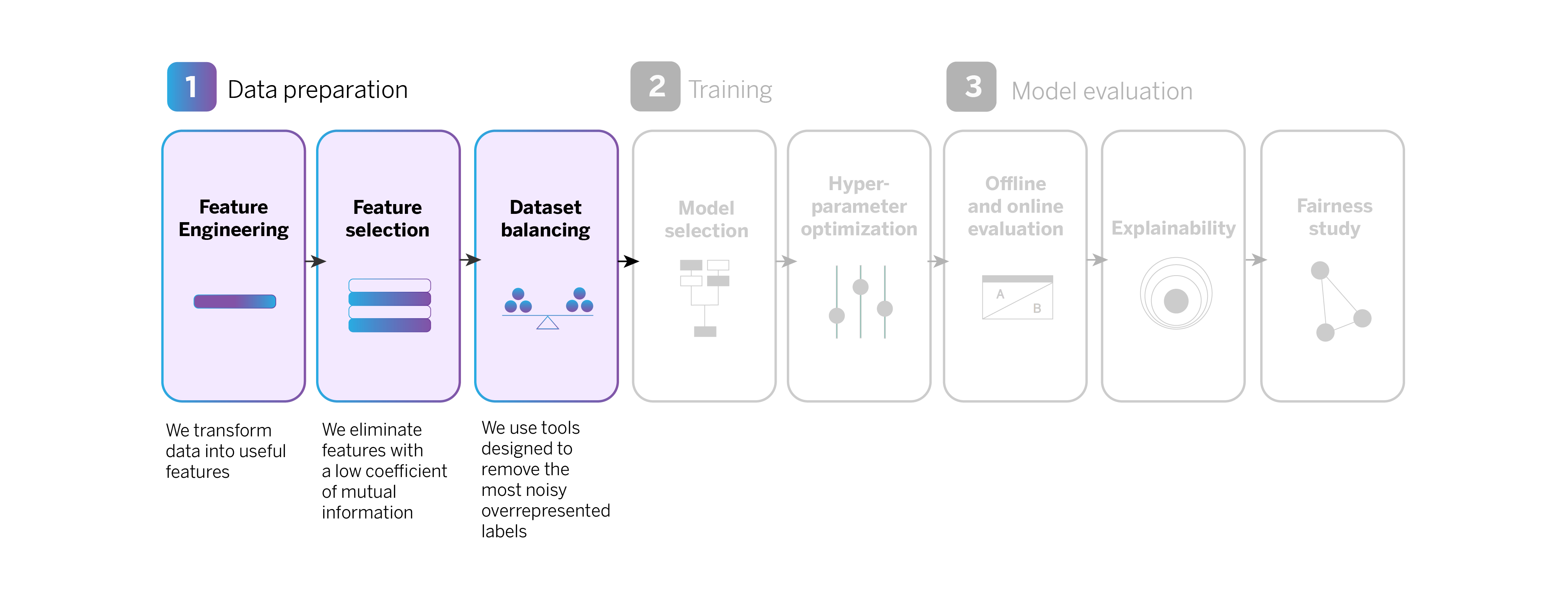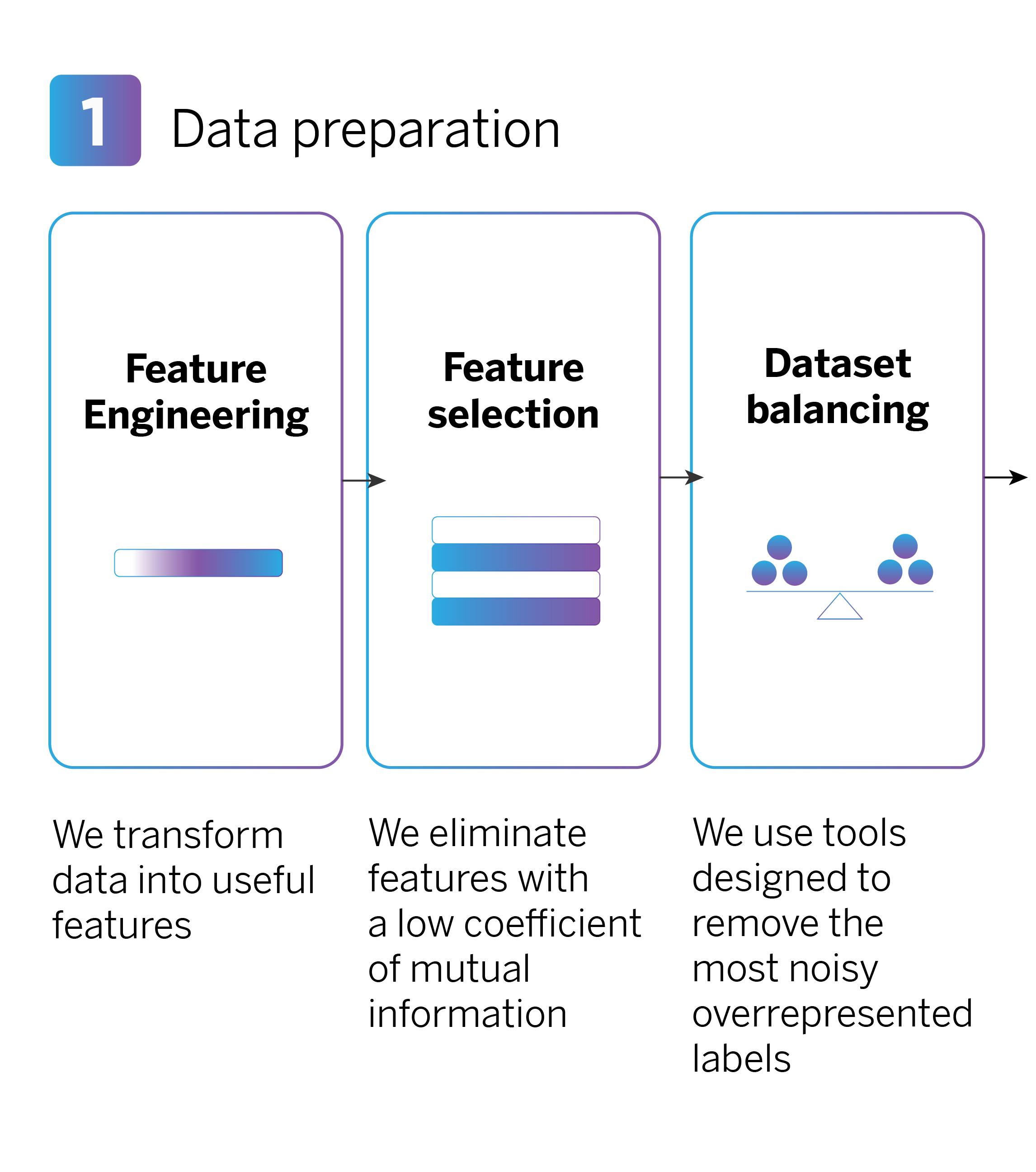 We collect data from various sources and carefully process it using feature engineering. This technique helps us convert the data into useful features, such as the average and maximum amount spent by the customer in the supermarket in the last month. This enables our artificial intelligence models to better comprehend our customers’ financial situation, their activity in our mobile app, and their interests. Over time, they can even discover new characteristics and patterns based on data analysis.