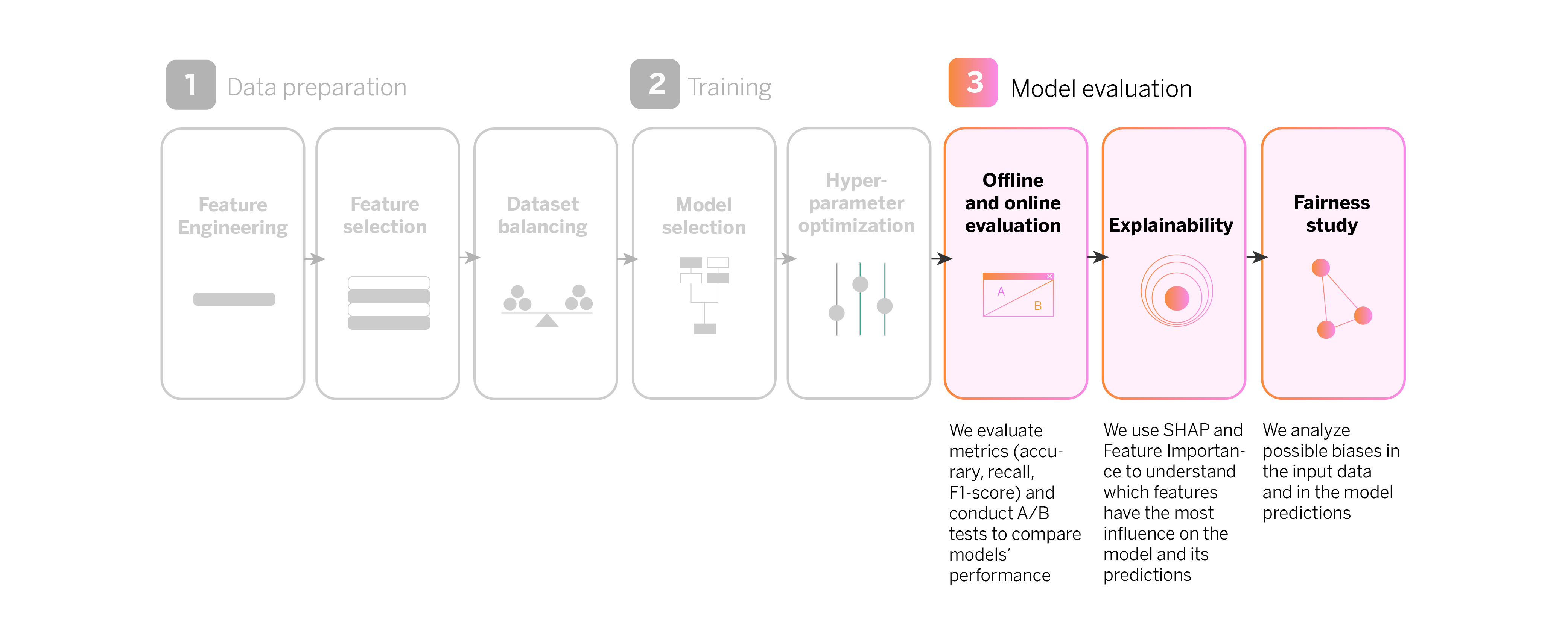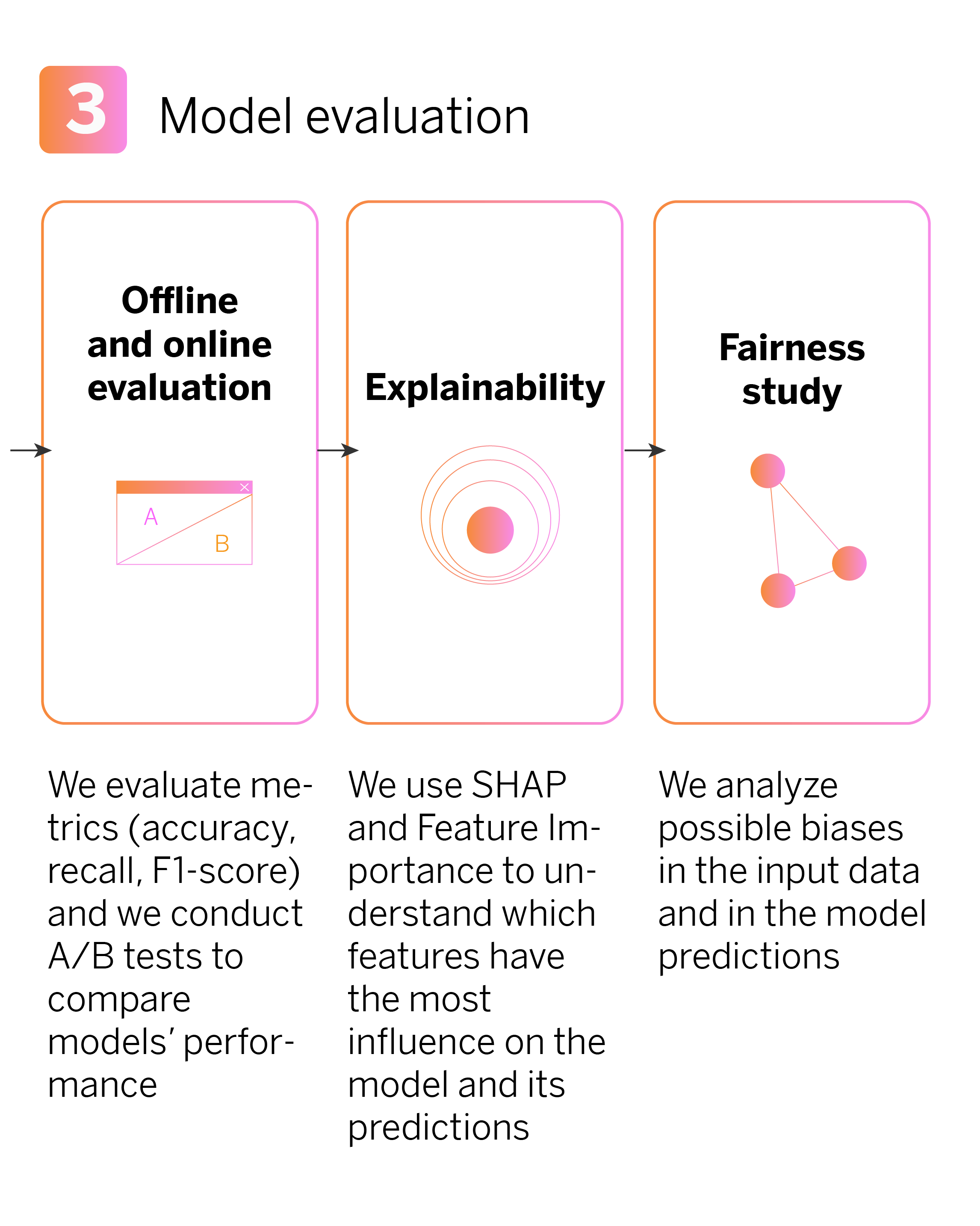 On the other hand, we perform A/B testing (online evaluation) to compare different versions of the model in production, where A would be one model and B a different one. By examining the conversion metrics of each model version, we can determine whether the results after updating it are statistically significant. This allows us to validate a new version of the model as long as it demonstrates a significant improvement compared to the previous version.