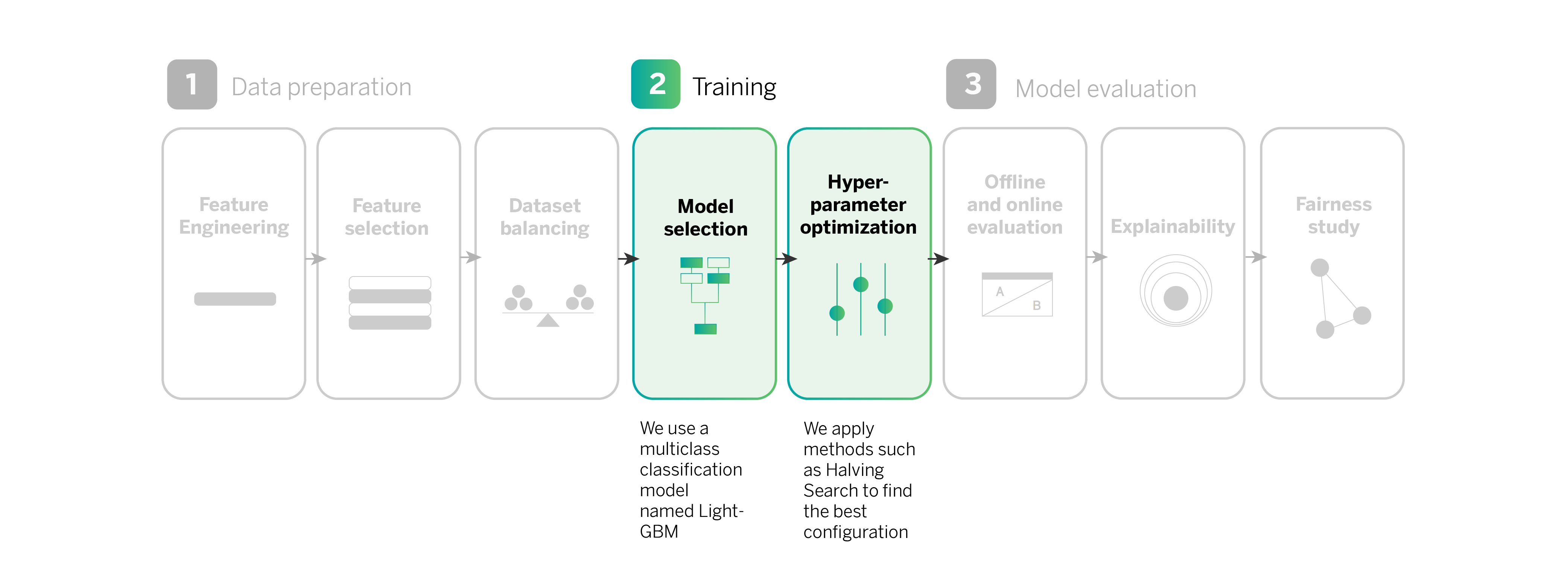 After preparing the data, the next step is to train a multiclass classification model to predict the types of products that a customer might need. In this instance, we utilize an algorithm based on decision trees’ models called LightGBM, which is highly efficient for this task.
