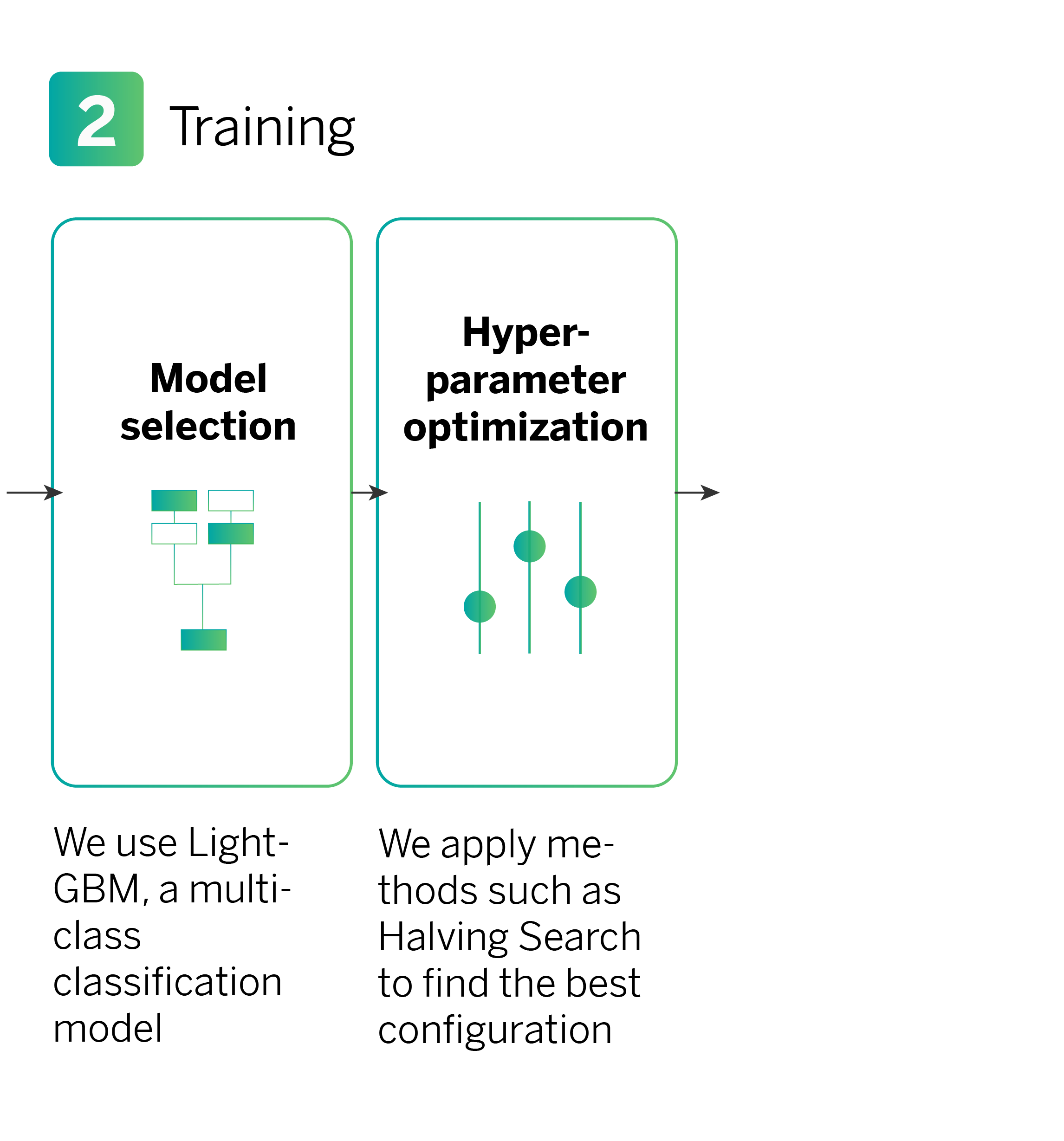 In the training process, we use the Halving Search method to optimize the hyperparameters. Hyperparameters are internal settings of the model that can be adjusted to enhance its performance (training speed) and behavior (model accuracy). Examples of hyperparameters include the learning rate and the number of iterations.