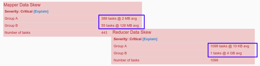 Dr. Elephant has two groups of metrics that help you detect data skewness in map and reduce stages. These are MAPPER DATA SKEW and REDUCER DATA SKEW groups.