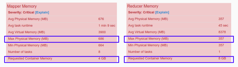 A common mistake made by users when trying to increase the performance of their queries is tuning the memory assigned to mappers and reducers to high values, even if it is not necessary. Dr. Elephant can surface these mistakes with two groups of metrics,