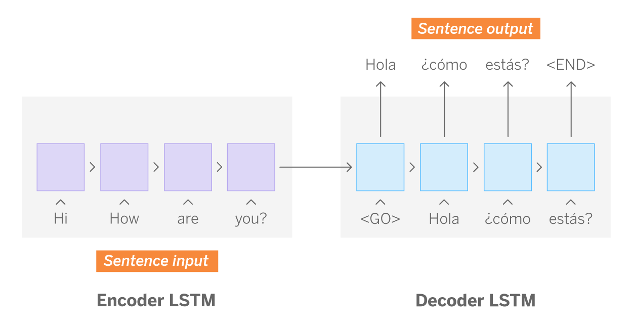 As mentioned above, the seq2seq architecture is composed of two LSTMs networks: encoder and decoder. Returning to the case of machine translation, the mission of the encoder network is to learn the structure of the given English sentences (input sequences), while the decoder does the same with the Spanish sentences (output sequences). The decoder also learns the relationship between both sequences. In this way, the result of the last cell of the encoder is a vector, called thought vector. This stores the information of the previous cells and therefore, it is a mathematical representation of the English sentence, i.e., the input sequence. Finally, the decoder uses these vectors together with the response also encoded in mathematical representation for training. During training, the network learns the patterns that allow it to associate an input sequence with an output sequence.