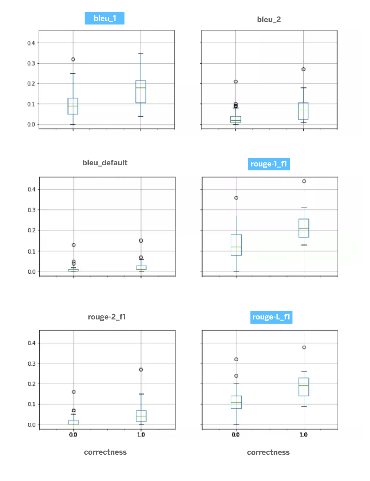 The following figure represents the correlation between the manual evaluation (false: wrong answer, true: correct answer) and the values of the automatic metrics. In a first analysis we observe that bleu_1, rouge_1 and especially rouge-L are the metrics that best align with the human criteria. This is important for the optimization of the seq2seq architecture and for the automatic evaluation of the system. Although this study would require further research, we consider it sufficient for this prototyping phase.