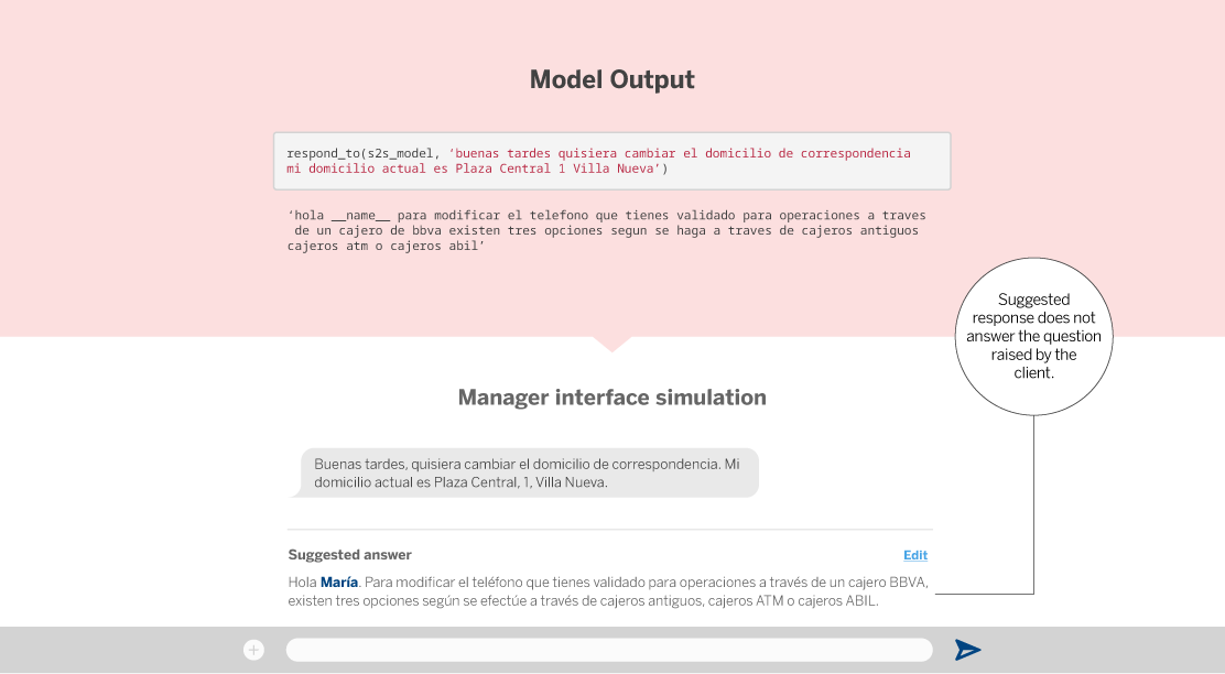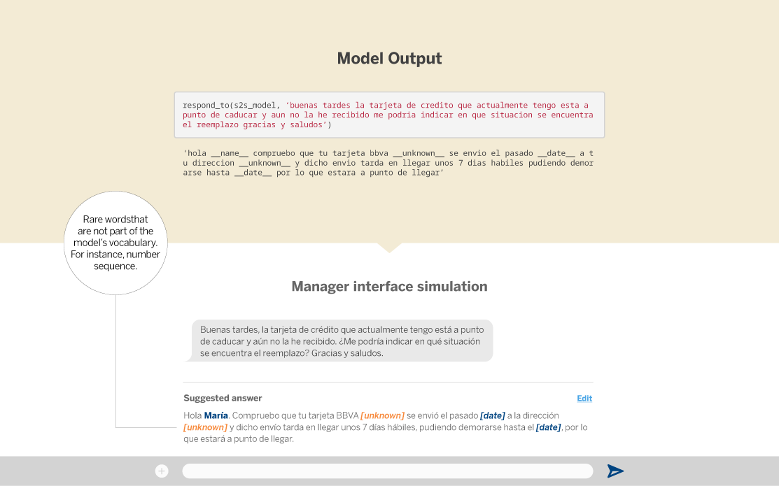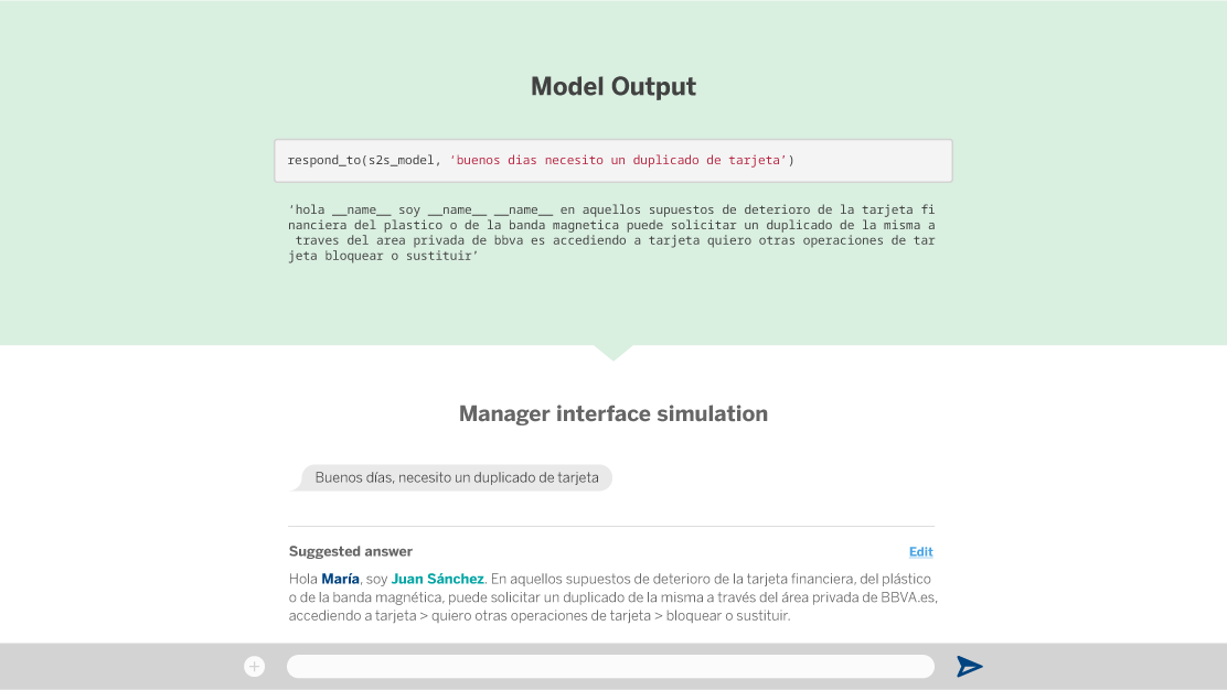 With these first tests performed with seq2seq (we have omitted some failed experiments and other decisions made along the way), we have been able to demonstrate the enormous potential of this technique in the context of client-manager communications at BBVA. A seq2seq-based system is able to suggest answers to simple client questions. However, for many other tasks, such as answering questions related to the specific context of a client, it is much better to opt for a direct contact with our BBVA managers.