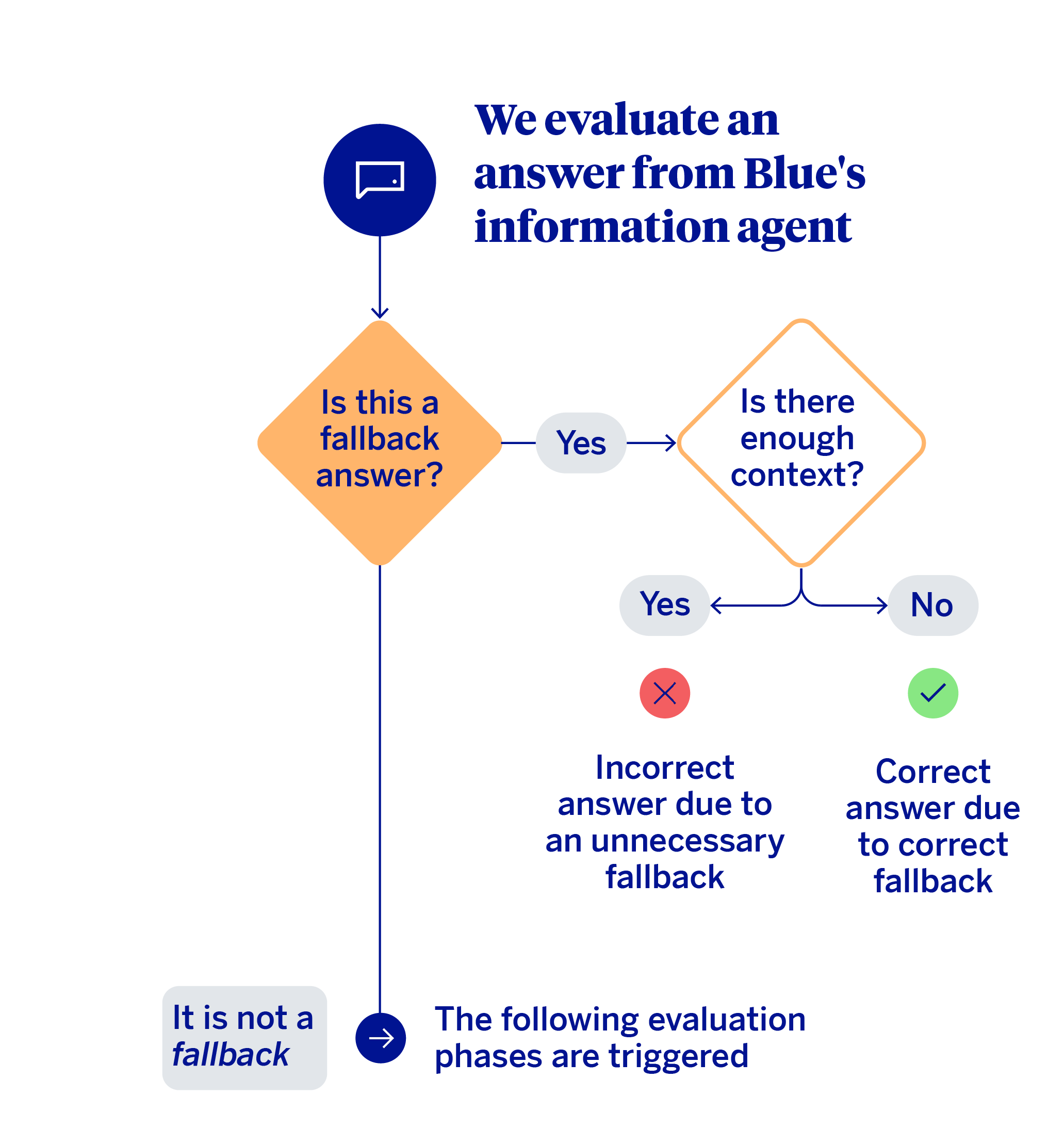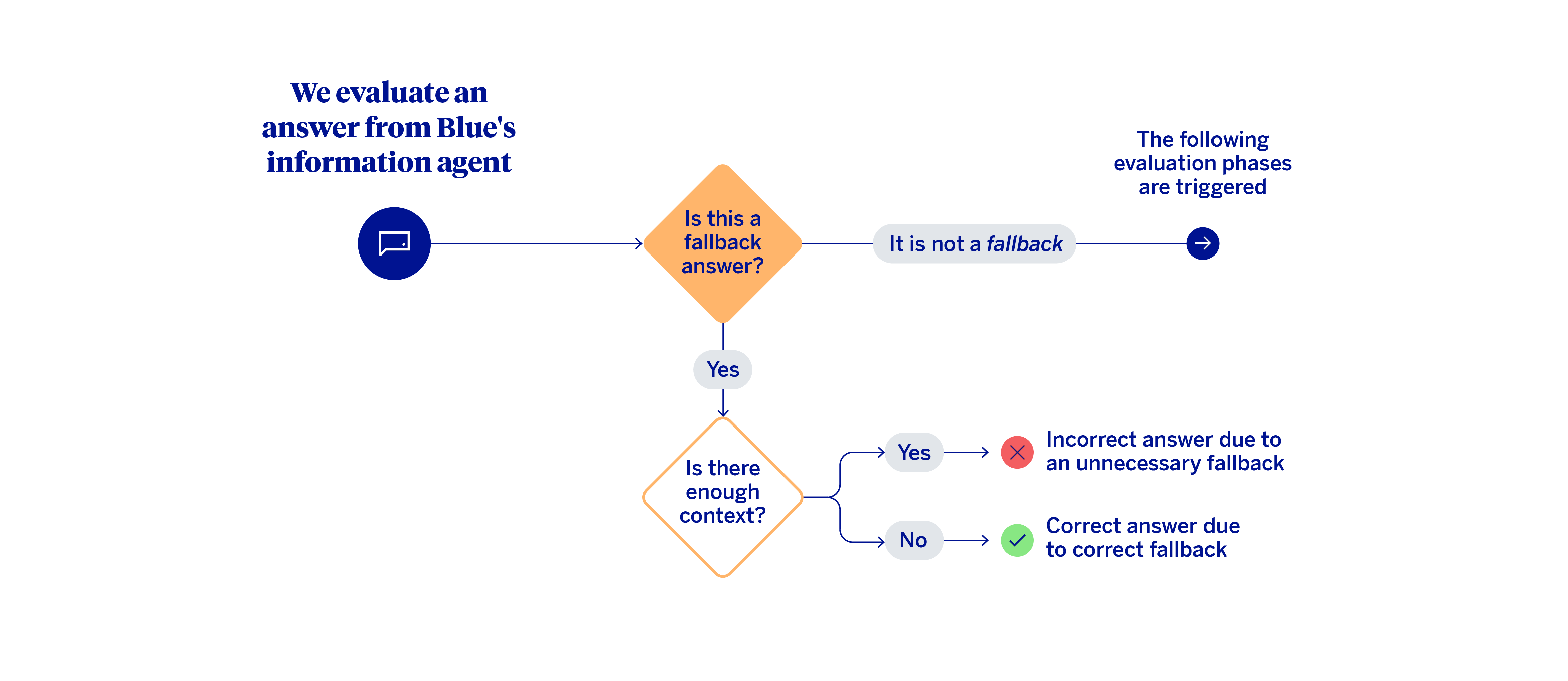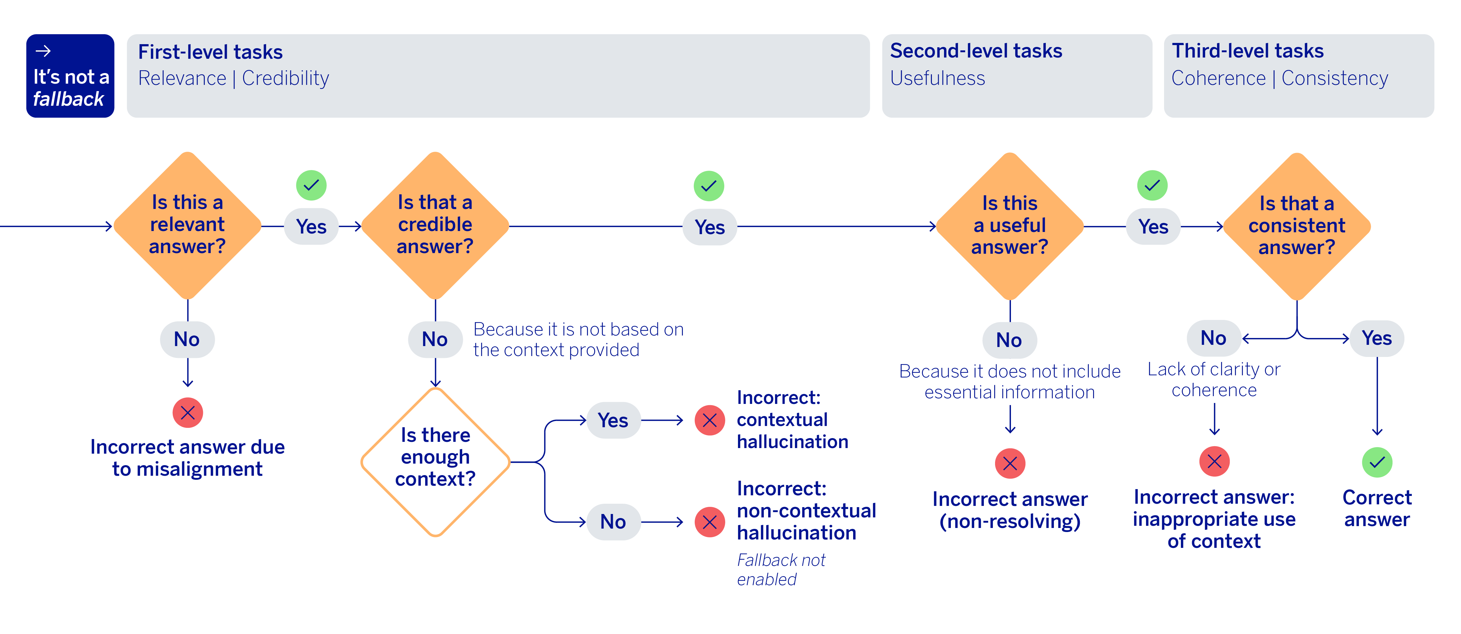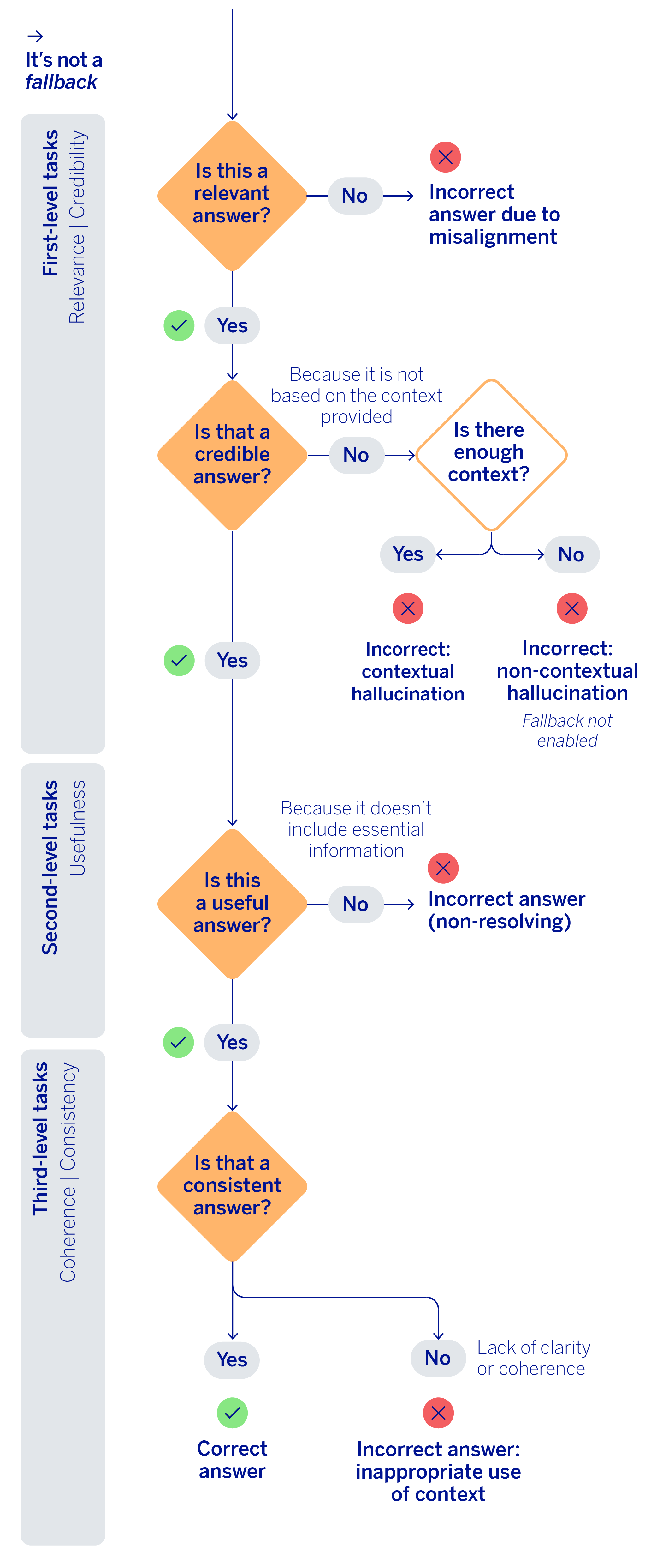 When a fallback occurs, the key question is whether or not the agent actually had sufficient context (knowledge base) to answer. If the context was insufficient, performance could be considered correct. On the other hand, if there was relevant information to respond to the query, and the system still opted not to, then it was an unnecessary fallback. In these cases, the system should have answered the query. When there is no fallback, meaning the agent responds to the specific question the customer asked, the heuristic proceeds to a multi-level evaluation.