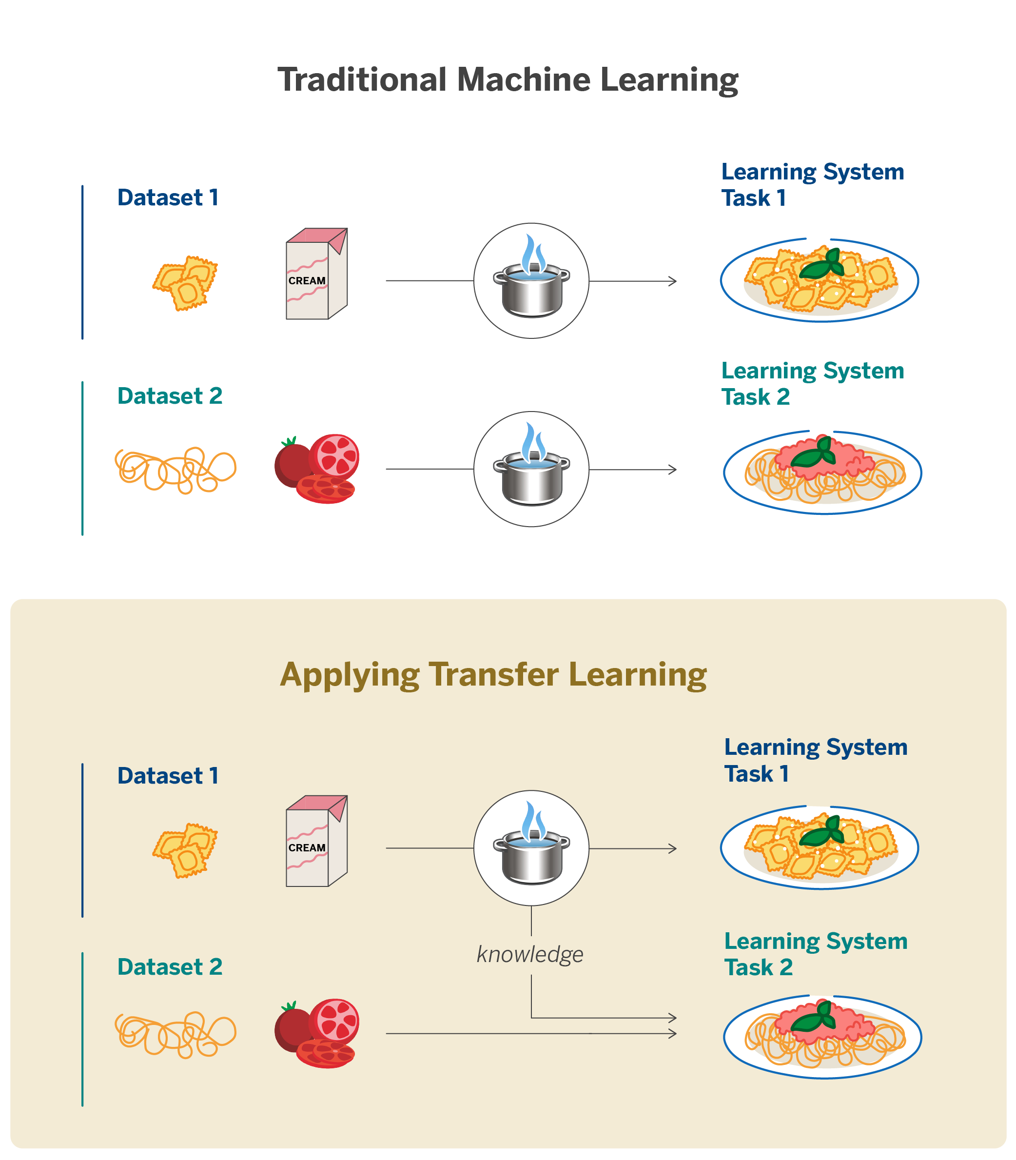 The aim of using Transfer Learning is for our chef – the best at cooking ravioli carbonara – to be able to apply what s/he has learnt in order to make a decent spaghetti bolognese. Even if the sauce is different, the chef can re-use the previously acquired knowledge when cooking pasta (figure 1).