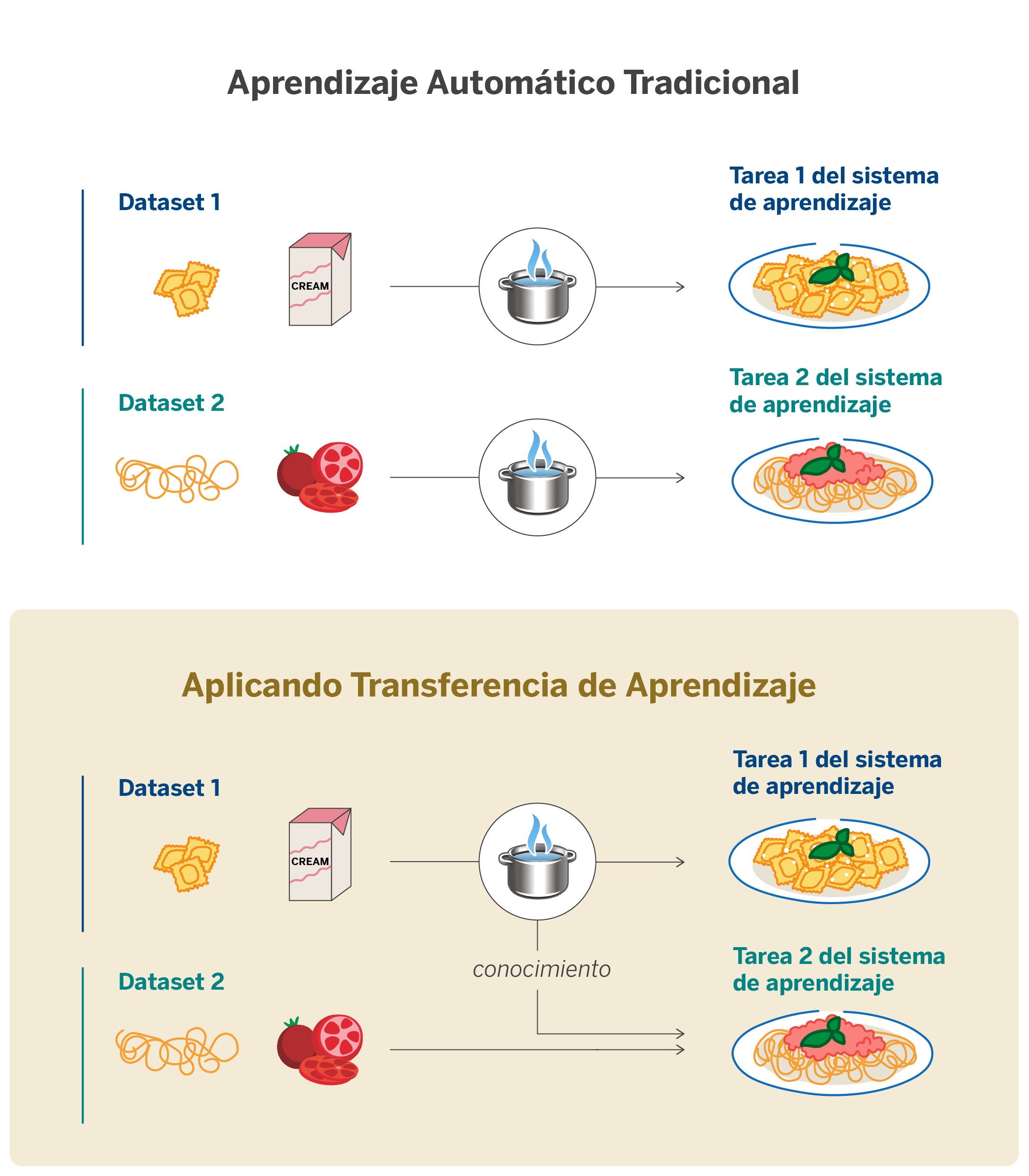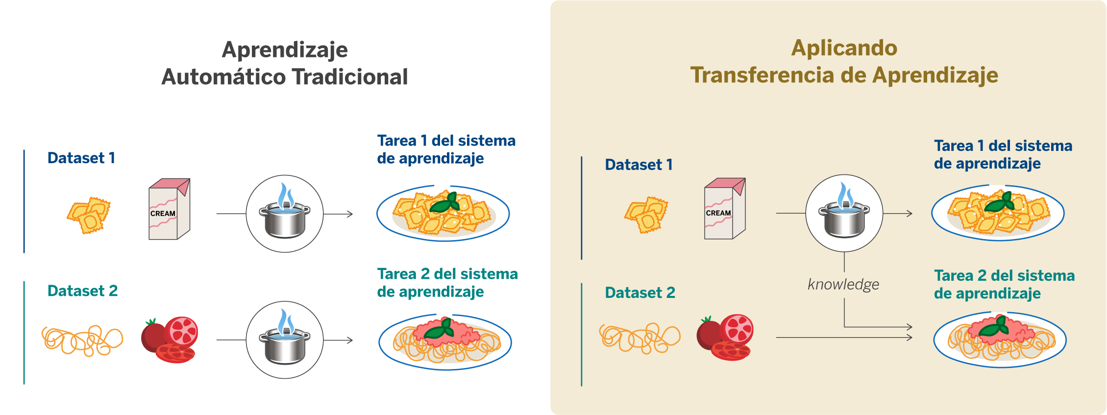 El objetivo de utilizar Transferencia de Aprendizaje es que nuestro cocinero -que es el mejor cocinando ravioli carbonara- sea capaz de aplicar lo aprendido para alcanzar un éxito razonable cocinando unos spaguetti a la boloñesa. Aunque la salsa sea diferente, puede reutilizar el conocimiento adquirido a la hora de cocer la pasta (figura 1).