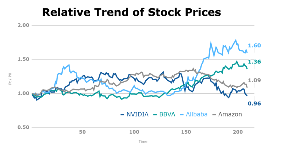 Para evaluar el rendimiento del algoritmo, decidimos utilizar cinco activos, obteniendo sus datos históricos mediante la biblioteca Python de Yahoo Finanzas, yfinance: Amazon (AMZN), Alibaba (BABA), BBVA (BBVA), Nvidia (NVDA), y un activo de bajo riesgo como son los bonos del gobierno estadounidense.