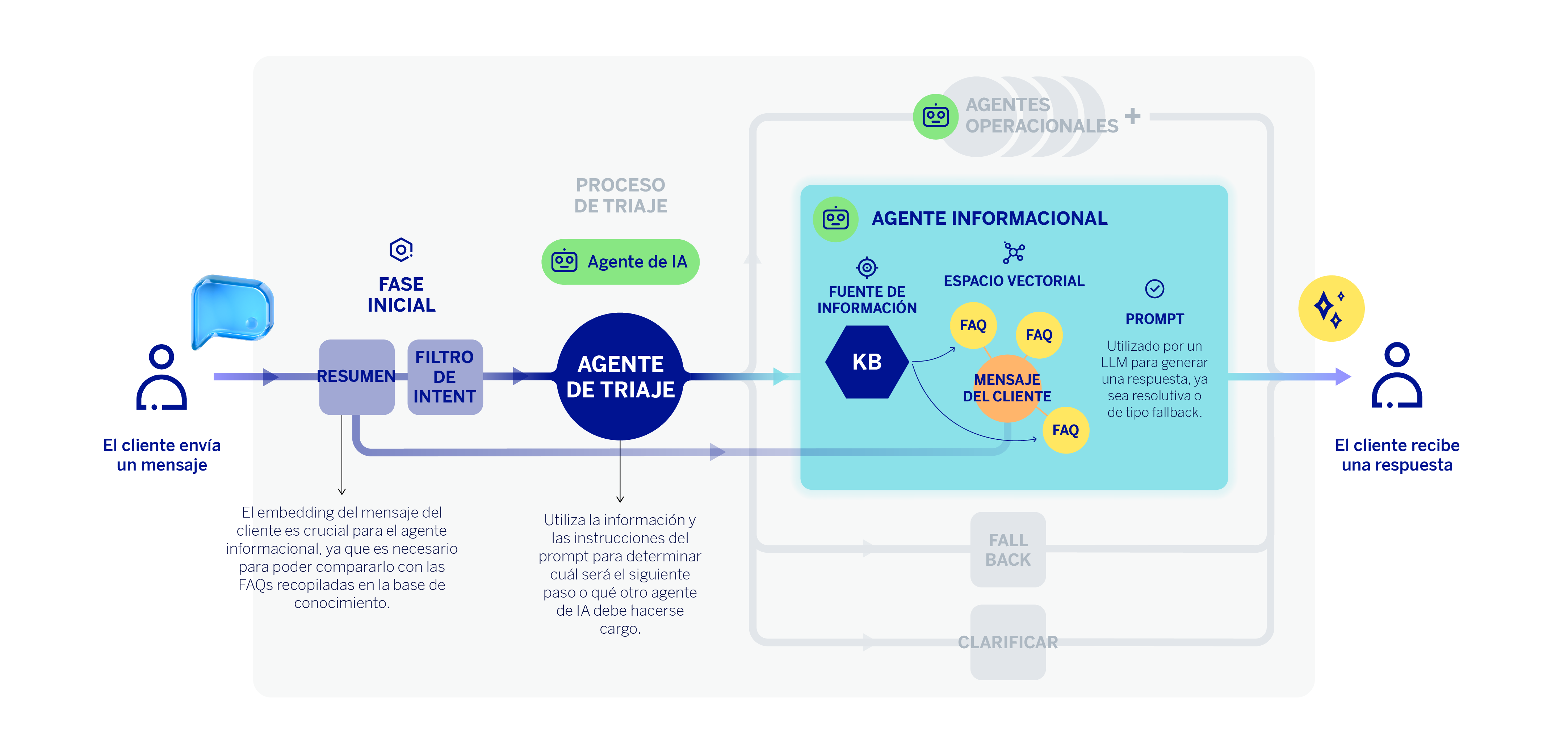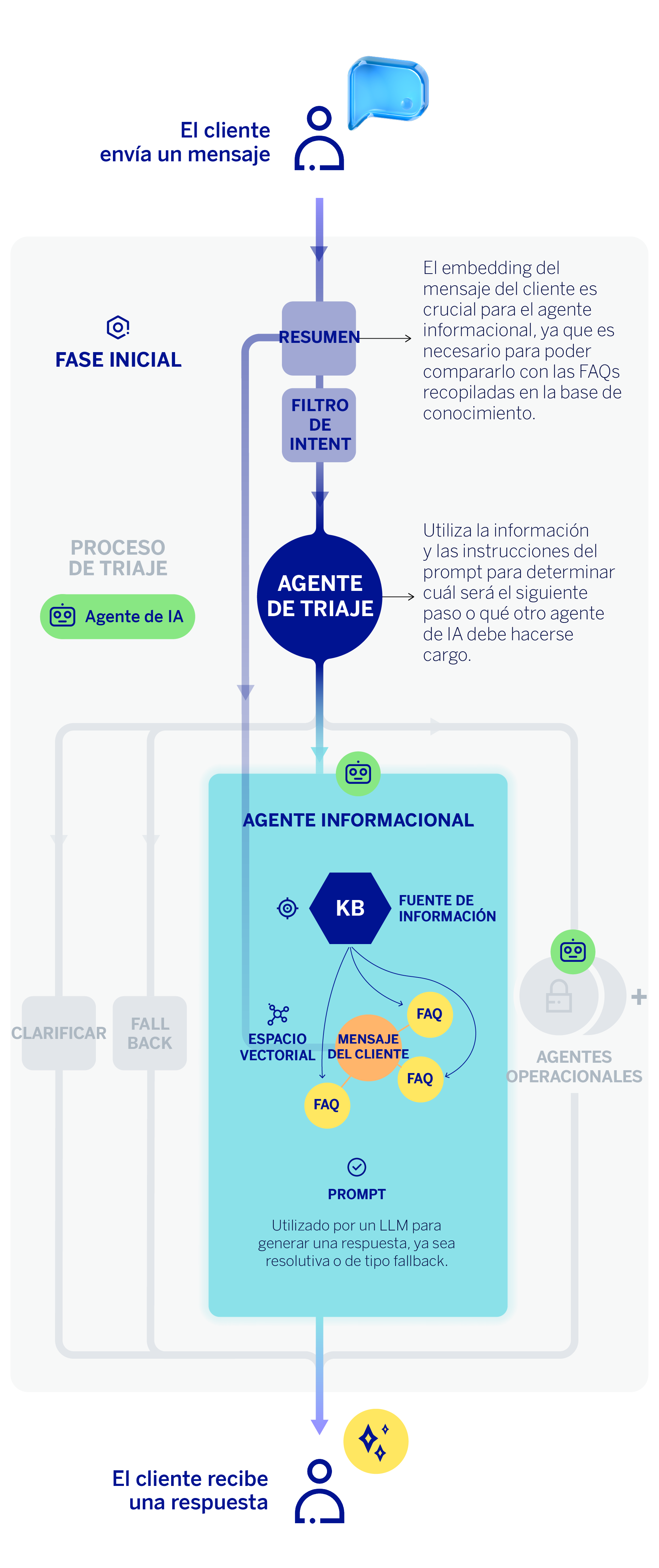 Una vez realizado este proceso, el LLM del agente informacional recibe un prompt que incluye: el mensaje reformulado o contextualizado del cliente, las FAQs más parecidas semánticamente —obtenidas del proceso anterior—, y una lista de instrucciones diseñadas por el equipo técnico. Cuando el LLM dispone de información suficiente y cumple los requisitos, se genera una respuesta fundamentada en la base de conocimiento que llega directamente al cliente como contestación a su consulta.