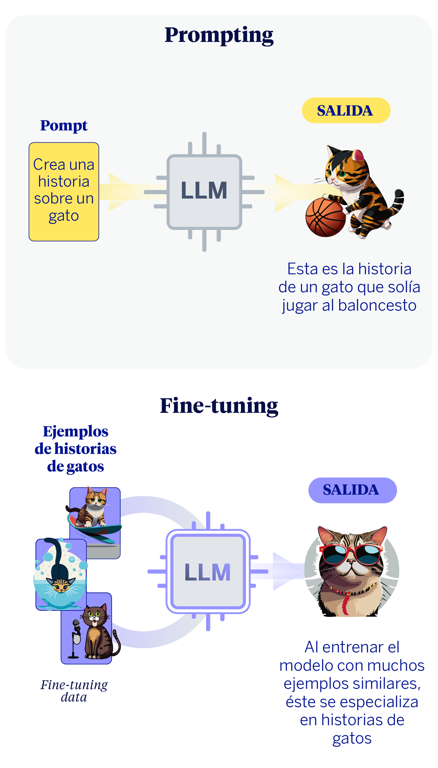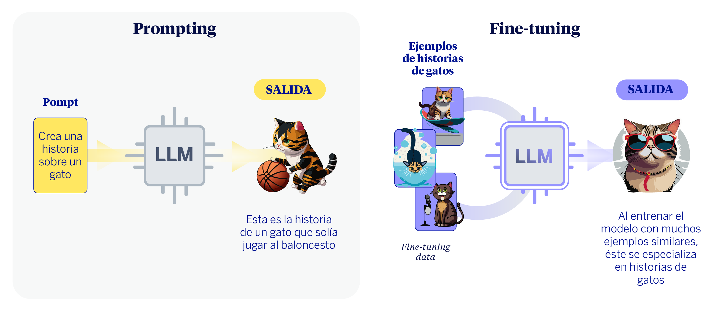 Para adaptar un LLM a un caso de uso o necesidad de negocio generalmente podemos seguir dos caminos. El primero es la ingeniería de prompts, que consiste en darle instrucciones muy claras y detalladas al modelo. Es como si le diéramos a un asistente muy capaz y polivalente una lista de tareas perfectamente descrita, con el contexto, las restricciones y el formato de respuesta deseado para que la ejecute sin fallos. No se modifica la habilidad general del asistente, sino que se perfecciona la calidad de la petición para obtener un resultado excelente.