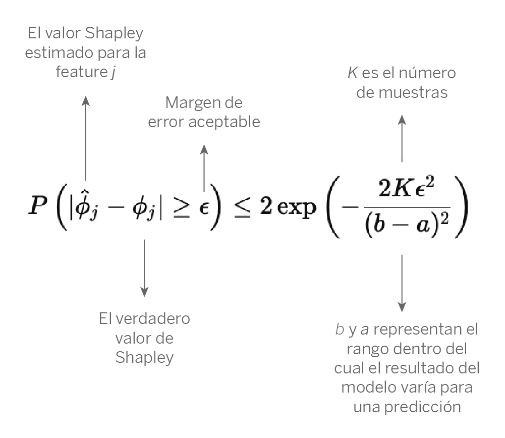 Aplicando la desigualdad de Hoeffding, podemos establecer que, para un número suficientemente grande de muestras K, la probabilidad de que nuestra estimación del valor de Shapley se desvíe del valor real en más de un pequeño margen de error llega a ser muy pequeña. Esto viene dado por: