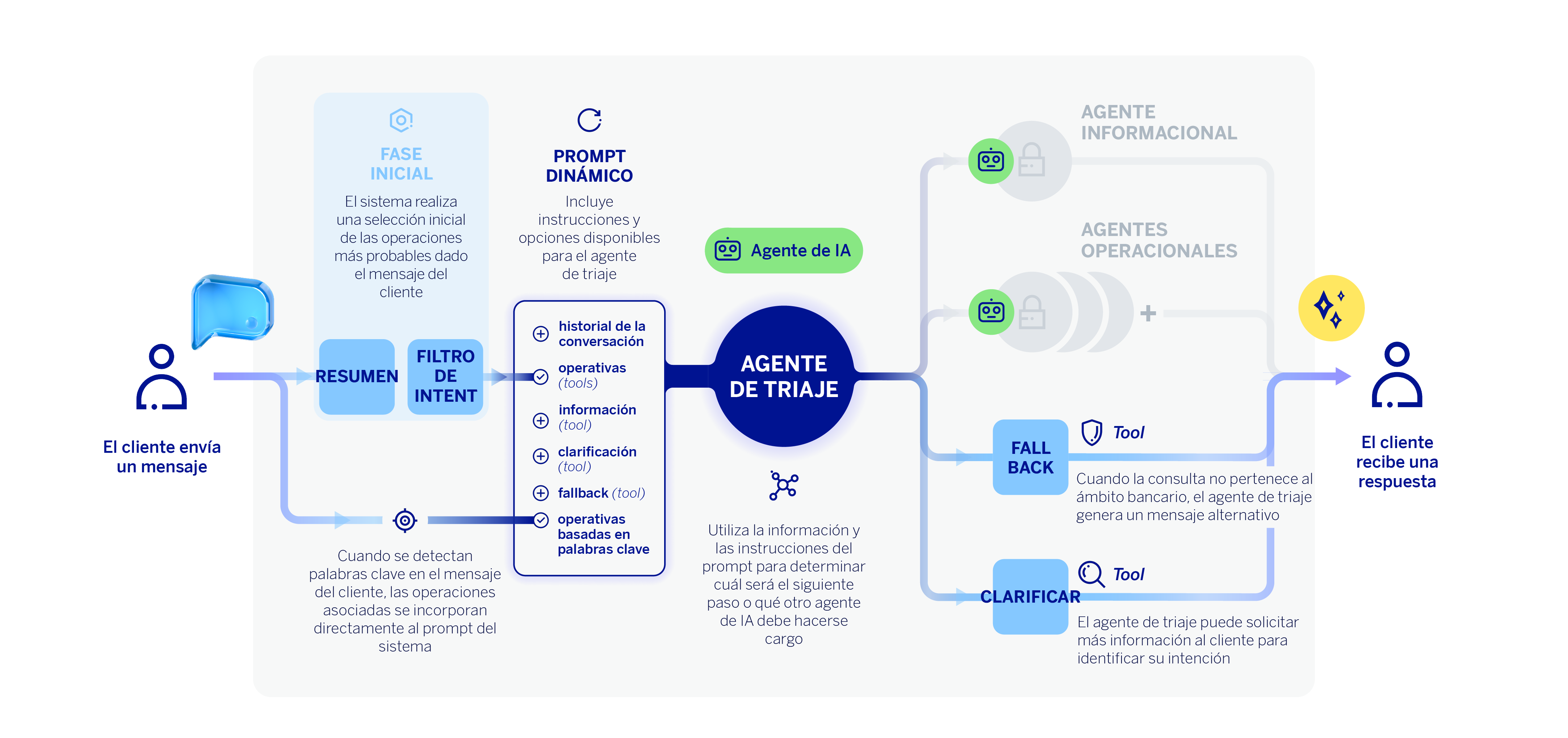 En este artículo presentamos nuestro trabajo implementando un asistente conversacional de atención al cliente, que no solo entiende al usuario, responde con información relevante y sigue el hilo de la conversación, sino que además lleva a cabo operativas bancarias básicas de principio a fin. Esto es posible gracias a una arquitectura basada en agentes inteligentes: componentes autónomos especializados que colaboran desde la comprensión de la intención del usuario, es decir, el propósito u objetivo que un usuario busca alcanzar a través de su mensaje o consulta, hasta la ejecución de una operativa concreta. Para empezar, nos centraremos en el actor principal de nuestro sistema, un agente de IA encargado de identificar la necesidad del cliente o usuario y decidir cómo resolverla. Se trata del agente clasificador o agente de triaje.