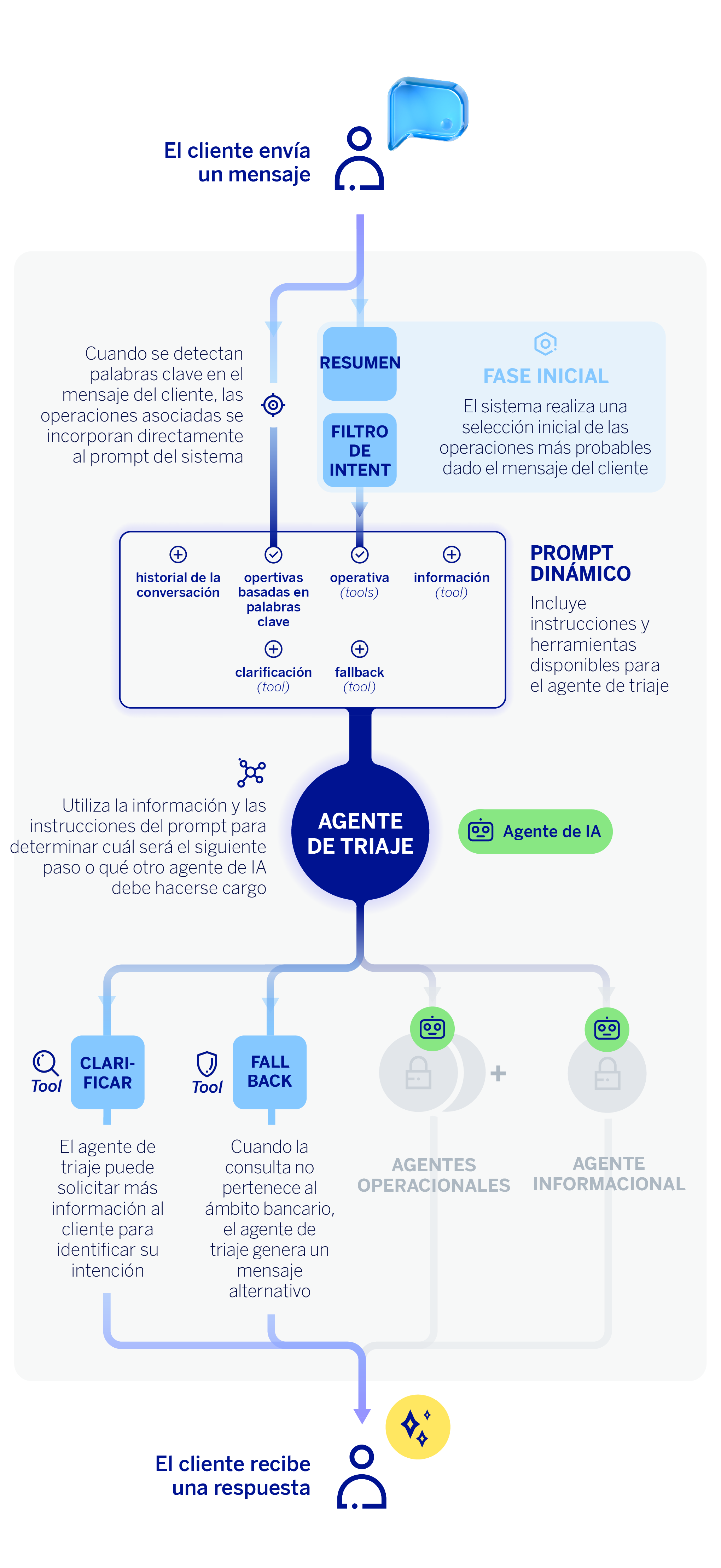 En resumen, el agente de triaje utiliza un gran modelo de lenguaje (LLM) que actúa como un experto bancario virtual capaz de analizar el contexto completo de la conversación. Funciona como el “centro de decisiones” de nuestro asistente, esto es, se encarga de identificar y clasificar la petición del cliente en tres categorías principales: ejecutar una operativa —y en ese caso, determinar la operativa concreta—, responder a una consulta con información general o pedir más información al cliente.