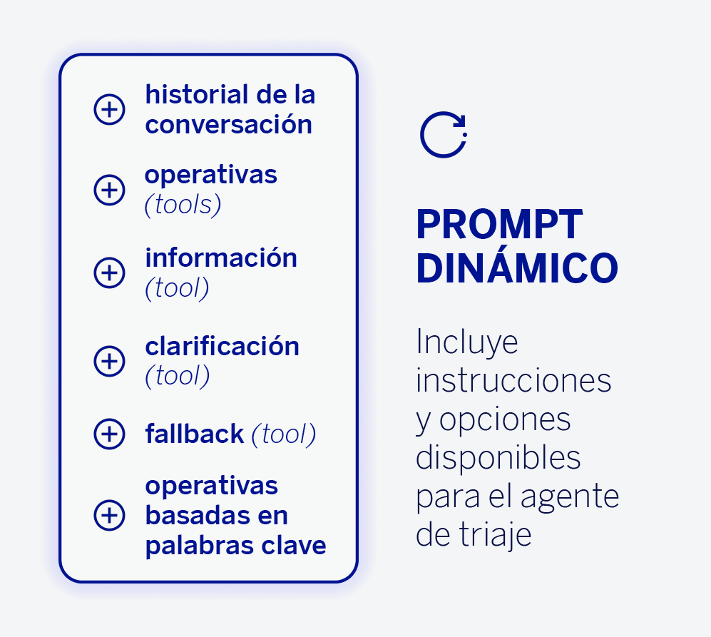 Desde el punto de vista técnico, este motor de decisión —el agente de triaje— utiliza los modelos más avanzados de tipo GPT (OpenAI). El sistema emplea una arquitectura basada en herramientas (tools), que representa un enfoque innovador en el diseño de sistemas conversacionales. Además, el agente dispone del historial de la conversación, así como de un conjunto de instrucciones en forma de prompt dinámico. Estas instrucciones ofrecen indicaciones al agente de triaje sobre cómo debe operar.