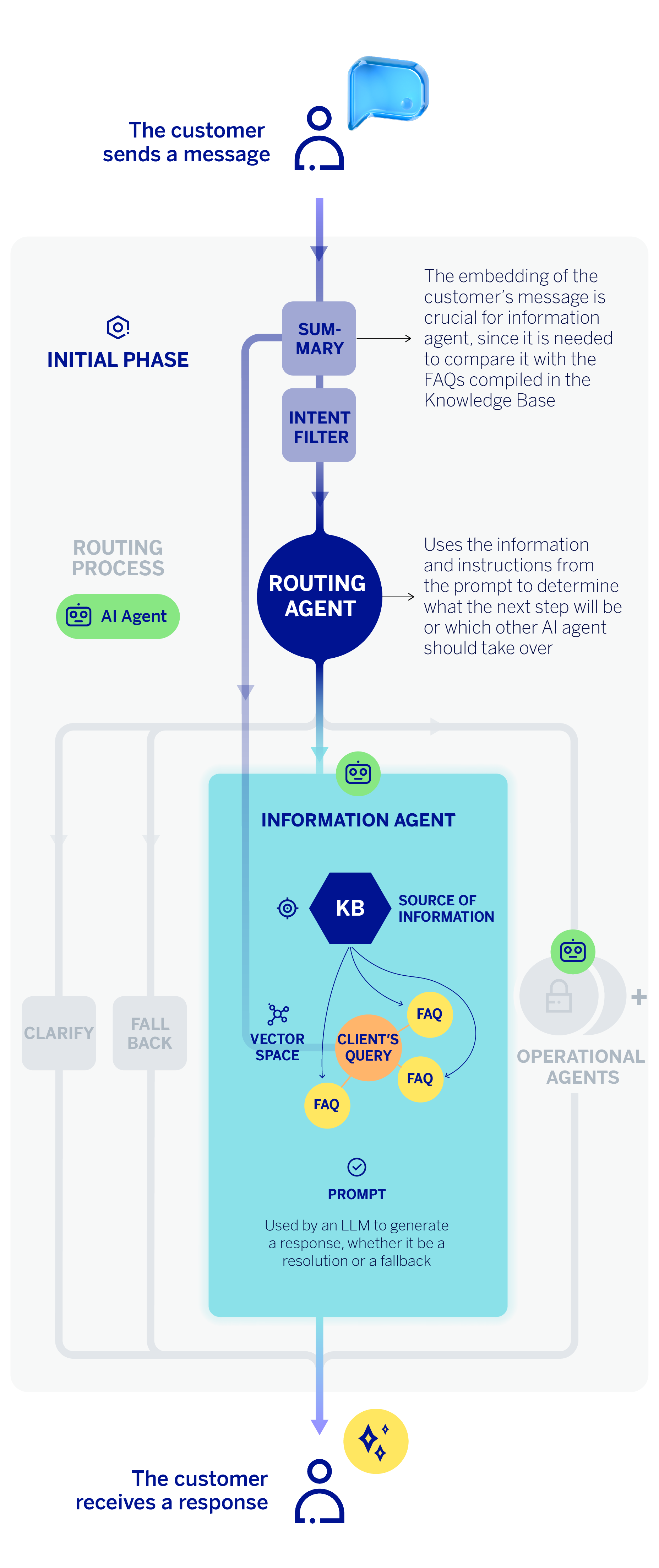 When a user sends a query to our assistant, it does not reach the information agent directly; instead, it first goes through a routing process that we covered in a previous article. This process is carried out by the classifier agent and essentially consists of identifying what the user wants to do. If the routing agent determines that the query is informational, the task is routed to the information agent.