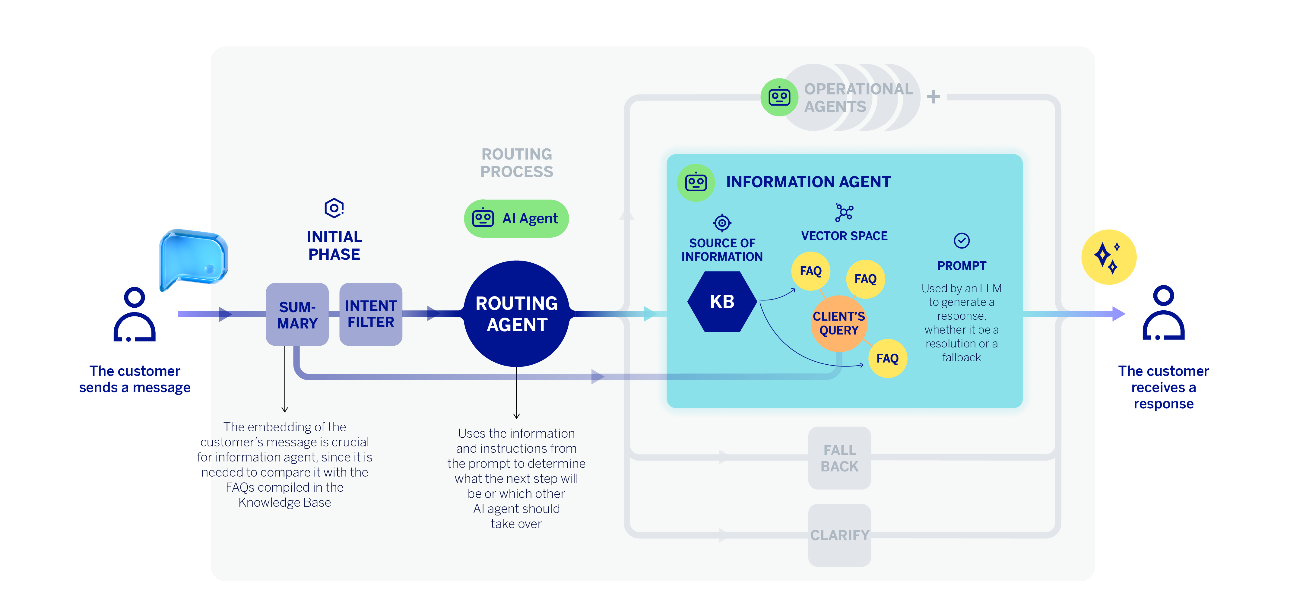In this article, we will delve into the workings of what we have called the information agent; the first generative AI–based agent that we implemented across our customer interaction channels. The primary function of this agent is to provide accurate responses to generic queries related to the banking domain, as well as to BBVA’s procedures or products.