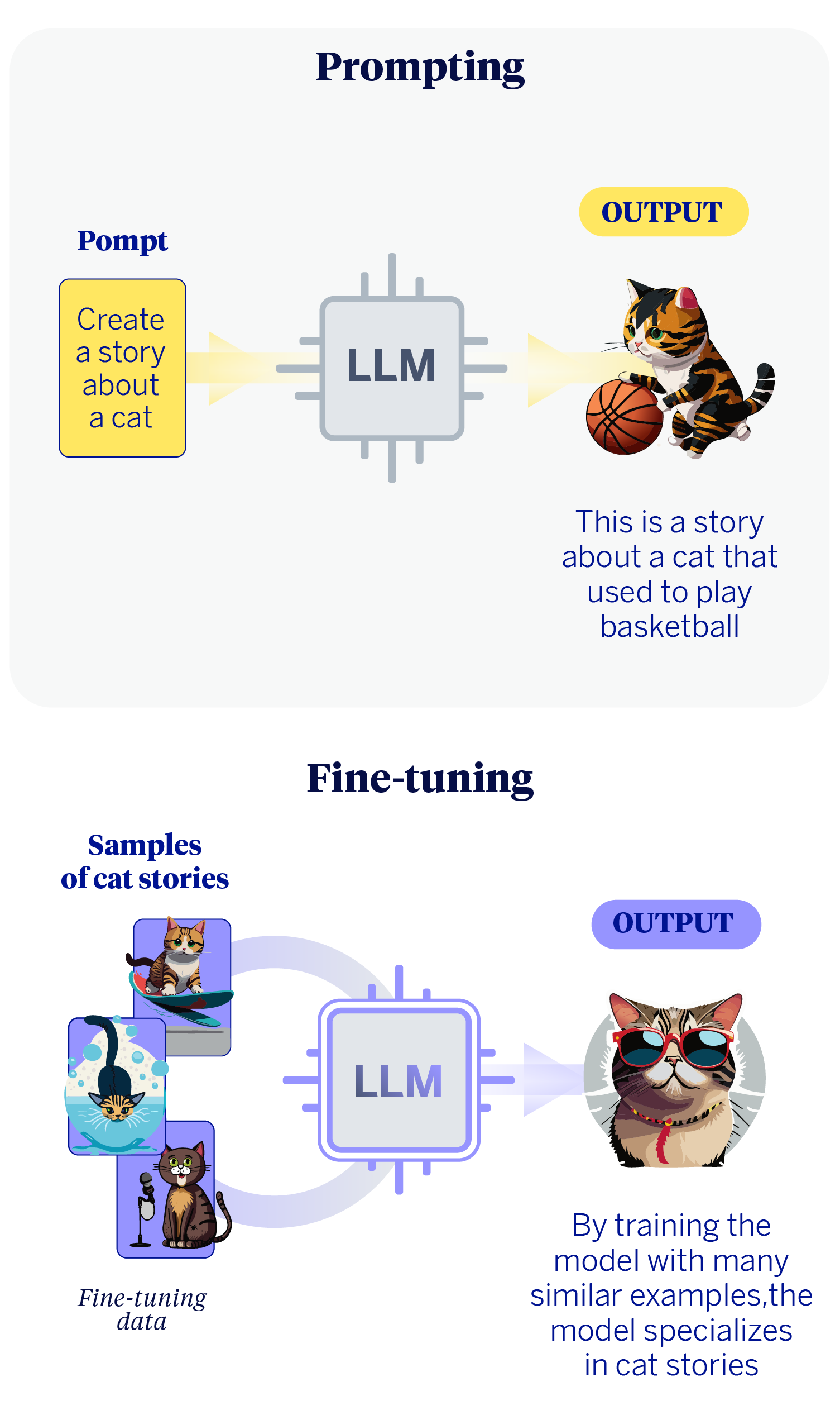 The second strategy we can follow is fine-tuning. This process goes a step further: instead of just giving instructions, we slightly modify the model’s base behavior by training it with hundreds or thousands of specific examples of our task. Following the analogy, it would be as if the assistant received intensive and specialized training, so that it becomes an expert in a specific area, such as interpreting financial reports, for example. Its fundamental knowledge does not change, but it acquires a new nuance, a specialization.